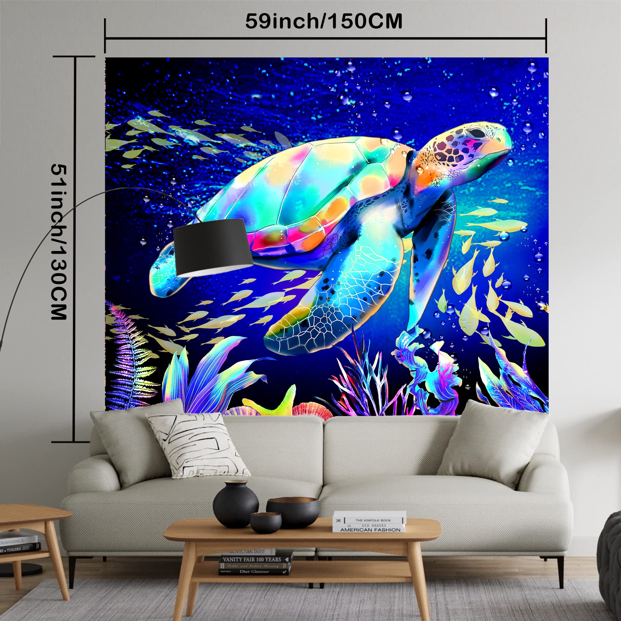 Wow - dieses Tapestry leuchtet unter Schwarzlicht! Die Meeresschildkröten sehen tagsüber schon cool aus, aber unter UV-Licht wird's richtig magisch. Das 150x130 cm große Stück ist aus weichem Stoff und hat saubere Kanten. Perfekt für dein Zimmer, als Party-Deko oder Fotohintergrund. Die Farben sind super intensiv und die Details richtig sharp. Einfach aufhängen und dein Raum verwandelt sich in eine Unterwasserwelt. Macht sich auch mega als Geschenk - ob zu Halloween, Weihnachten oder einfach so. Für alle, die es etwas anders mögen! Einfach mal die UV-Lampe anmachen und staunen...