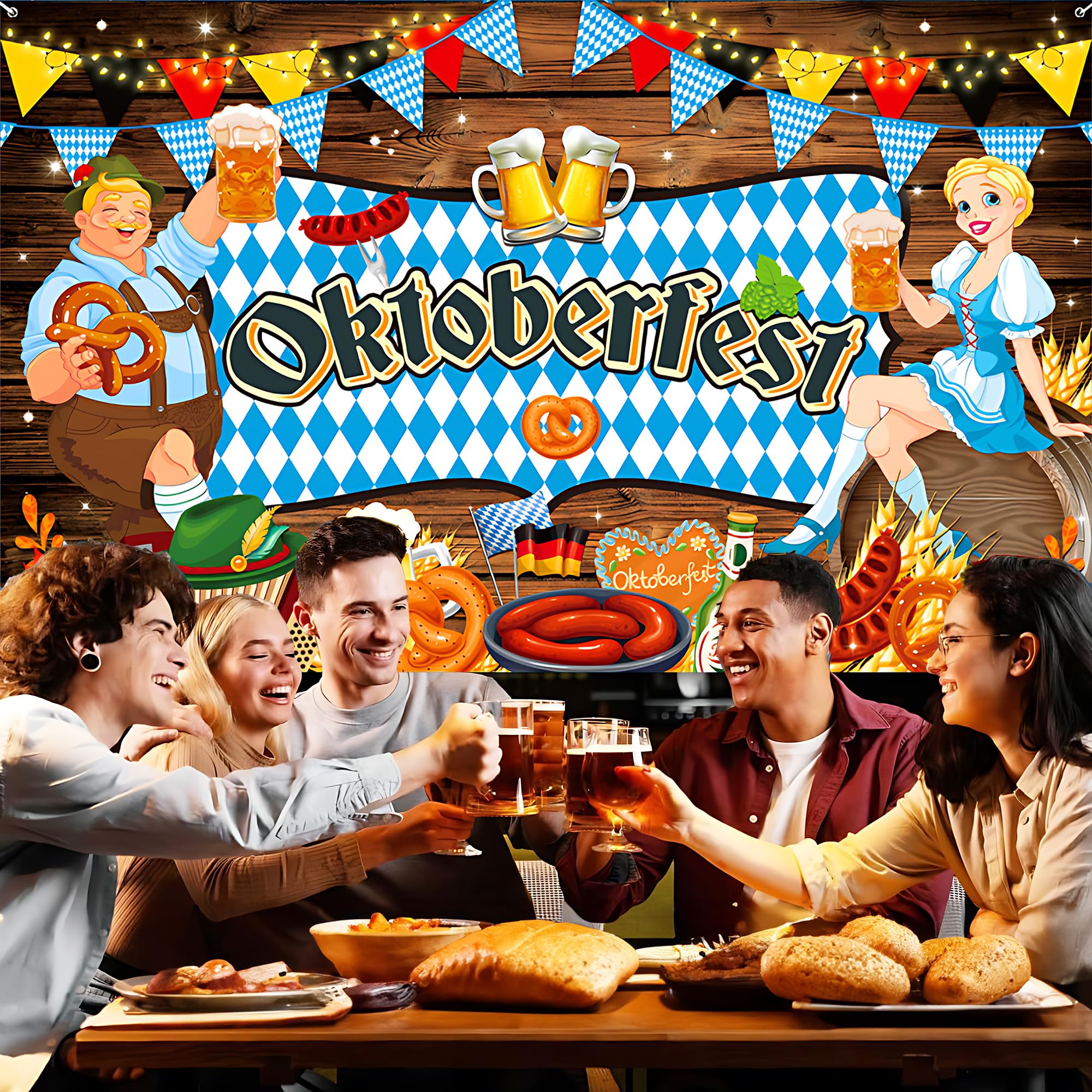 O'zapft is! Mit dieser Oktoberfest Fotowand holst du dir bayerisches Flair nach Hause. Das riesige Banner mit 185x110cm ist der perfekte Hintergrund für deine Wiesn-Party. Aus hochwertigem Polyestergewebe gefertigt, ist es waschbar, reißfest und wiederverwendbar. Das Design mit Biergläsern, Edelweiß, Lebkuchenherzen und Brezeln ist einfach authentisch! Mit den stabilen Aufhängebändern ist es in Minuten installiert. Ob im Biergarten, Zelt oder Wohnzimmer - diese Deko macht sofort Stimmung. Perfekt für Fotos, die tolle Erinnerungen schaffen! Deine Gäste werden begeistert sein - Prost!