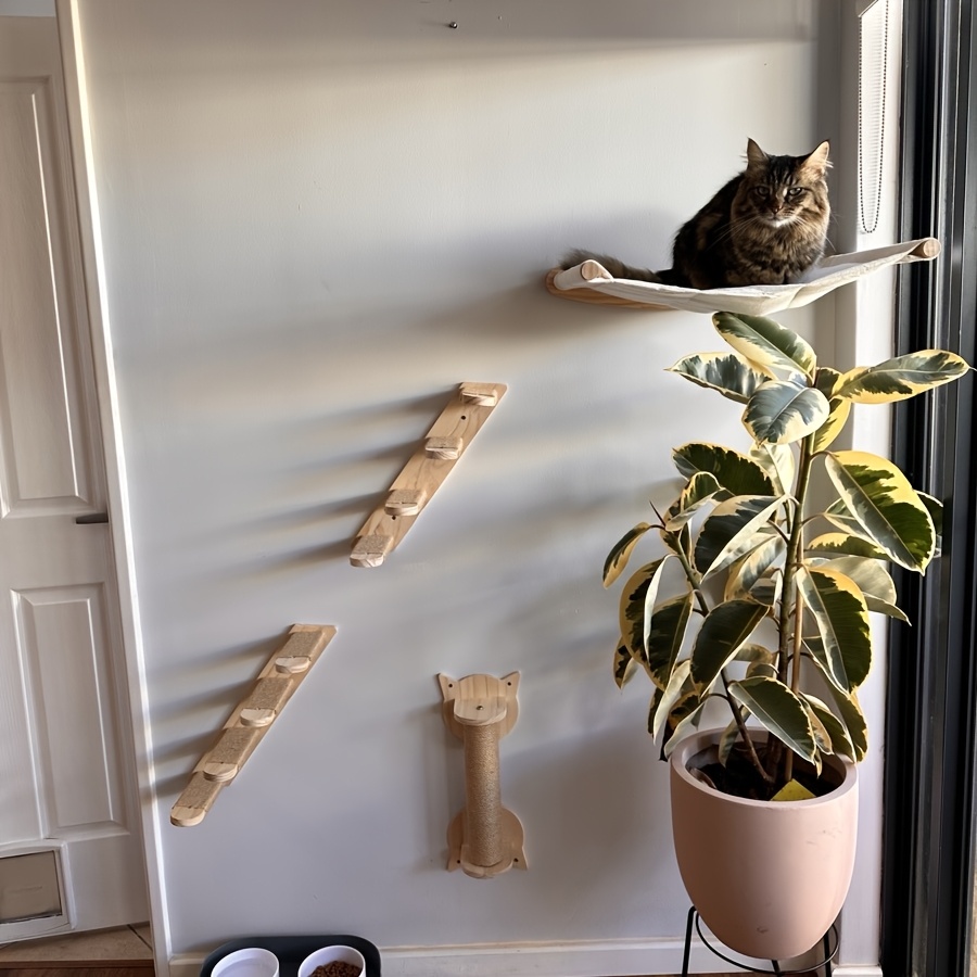 Deine Katze wird verrückt nach diesem Kletter-Set sein! Diese wandmontierte Kletterwand mit gemütlichem Katzenbett und 2 Stufen bietet deinem Stubentiger alles, was das Herz begehrt. Aus robustem 15mm Sperrholz gefertigt und mit Holzöl behandelt für lange Haltbarkeit. Die Stufen sind mit rutschfestem Teppich überzogen - sicher und bequem für deine Katze. Super platzsparend und stylisch passt es in jedes Wohnzimmer oder Büro. Einfache Montage mit beiliegender Anleitung und Material. Das Bett hat weiche Kissen für gemütliche Schläfchen in der Höhe. Endlich haben deine Katzen ihren eigenen Rückzugsort - und deine Möbel bleiben verschont!