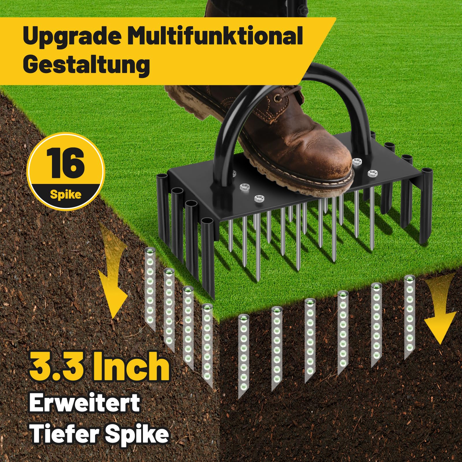 Dein Rasen wird's dir danken! Dieser manuelle Rasenlüfter mit 15 robusten Eisenspikes (jeweils 2,3 Zoll) lockert verdichtete Böden super effektiv. Das clevere Rückstellfeder-System zieht die Spikes automatisch wieder raus - kein mühsames Rausziehen mehr! Die Höhe ist von 83 bis 91 cm verstellbar, also für jede Körpergröße perfekt. Einfach in den Boden stechen, und schon bekommt dein Rasen mehr Luft, Wasser und Nährstoffe. Besonders praktisch vor dem Vertikutieren. Tipp: Bei trockenem Boden vorher wässern, dann geht's leichter. Macht aus einem müden Rasen wieder eine saftig-grüne Pracht! Stabiler Eisenrahmen mit Pulverbeschichtung - hält ewig. Einfach in der Handhabung und super effektiv.