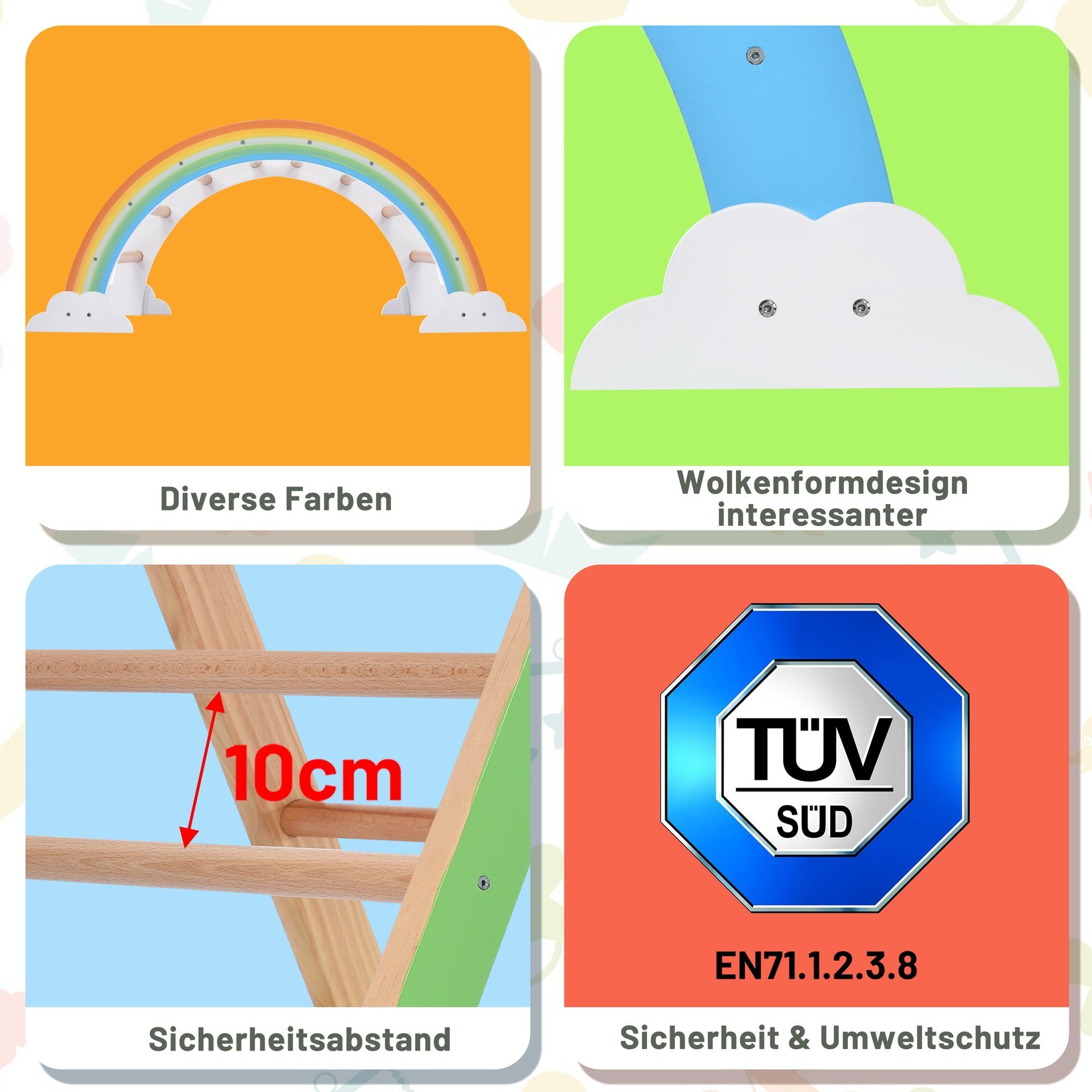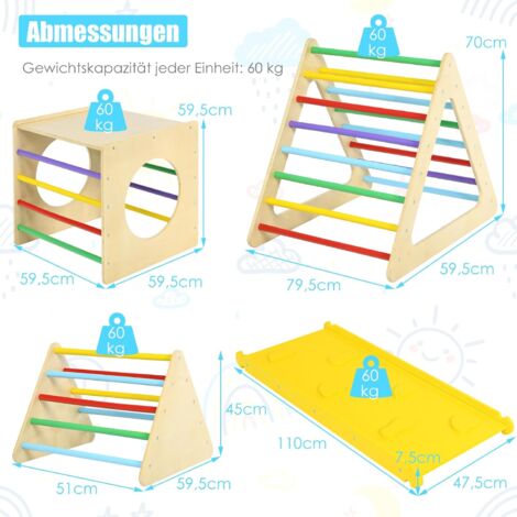 Ein ganzer Spielplatz fürs Kinderzimmer! Dieses 5in1 Klettergerüst von EROMMY bietet endlosen Spielspaß für kleine Entdecker ab 3 Jahren. Das Set besteht aus einem Kletterbogen mit Schaukelgestell, einem Kletterdreieck, einer 2in1 Rutsche und einer weichen Bogenmatte - alles was das Kinderherz begehrt! Das geniale: Alle Teile lassen sich leicht zusammenfalten und platzsparend verstauen - super praktisch wenn mal Besuch kommt oder mehr Platz gebraucht wird. Die robuste Konstruktion aus hochwertigem, geruchsneutralem E1-Holz trägt bis zu 91kg - also auch für etwas größere Kinder geeignet. Jeder Kletterplatz hat praktische Handläufe, die den Kleinen helfen, sich sicher vorwärts zu bewegen. Die mitgelieferte Matte schützt nicht nur vor Stößen, sondern lädt auch zum gemütlichen Draufliegen ein. Mit CE- und CPC-Zertifikaten getestet, kannst du dir der Sicherheit deines Kindes sicher sein. Einfache Montage mit wenigen Werkzeugen - die klare Anleitung führt dich Schritt für Schritt durch den Aufbau. Perfekt um motorische Fähigkeiten, Koordination und Gleichgewichtssinn zu trainieren - und das alles mit jeder Menge Spaß! Ein ideales Geschenk für Geburtstage, Weihnachten oder einfach so - damit verwandelst du jedes Kinderzimmer in eine echte Abenteuerlandschaft!