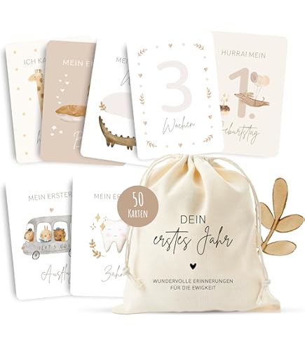 Oh wie süß! Mit diesen Meilensteinkarten kannst du das erste Jahr deines Babys ganz einfach festhalten. Stell dir vor: Jeden Monat machst du ein Foto mit der passenden Karte und siehst so, wie dein Kleines wächst und gedeiht. Das Set hat 7 Karten aus schönem Holz, jede ist doppelseitig bedruckt - also von 1 Monat bis 12 Monaten ist alles dabei. Sogar eine 'Hello World' und 'Welcome Home' Karte ist enthalten! Die Karten sind je 10x10cm groß und 0,25cm dick - also perfekt für kleine Babyhände. Super für Fotosessions, um die Entwicklung festzuhalten oder einfach als süße Erinnerung. Auch ein mega Geschenk für werdende Eltern zur Babyparty! Einfach die Karte neben dein Baby legen, Foto machen und den besonderen Moment einfrieren. So vergisst du nie, wie klein dein Schatz mal war!