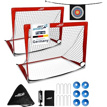 Fußballbegeisterte aufgepasst! Dieses Set hat alles, was du für coole Trainingseinheiten oder einfach nur zum Spielen brauchst: 2 stabile Tore, 6 Hütchen, 2 Ballzielscheiben, eine Koordinationsleiter, 20 Bodenhaken für extra Halt, eine Luftpumpe und eine praktische Tragetasche. Die Tore sind aus Fiberglas und robustem Netz - klappen nicht um, auch wenn mal kräftig geschossen wird. Aufbau? Mega einfach, ganz ohne Werkzeug. Und wenn du fertig bist, faltest du alles zusammen und packst es in die Tasche. Perfekt für den Garten, Park oder den Bolzplatz. Ob für Kids oder Erwachsene - hier kommt jeder auf seine Kosten. Und falls mal was ist - unser Support hilft dir schnell weiter. Viel Spaß beim Kicken!
