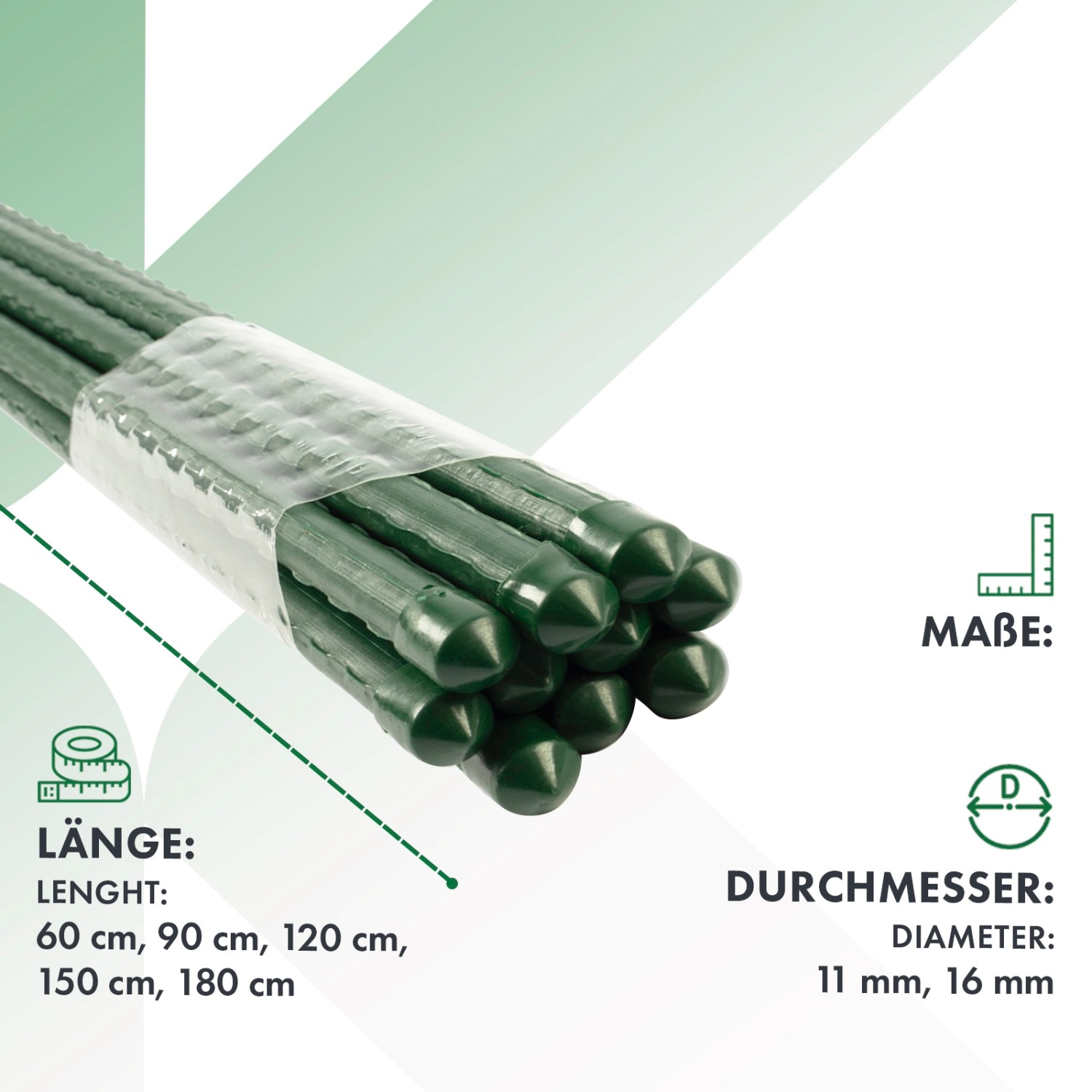 Deine Tomaten knicken um? Deine Blumen liegen am Boden? Mit diesen 10 Pflanzstäben gibst du deinen Pflanzen den Halt, den sie brauchen! Aus stabilem, kunststoffummanteltem Metall - rostet nicht und ist super langlebig. Mit Noppen für besseren Halt der Pflanzen. Erhältlich in verschiedenen Größen: 60, 80, 90 oder 100 cm Höhe, Durchmesser 8 mm oder 11 mm. Perfekt für Gemüse, Sträucher, Blumen - alles was rankt und klettert. Einfach in die Erde stecken und die Pflanze vorsichtig anbinden. Dein Garten wird es dir danken!