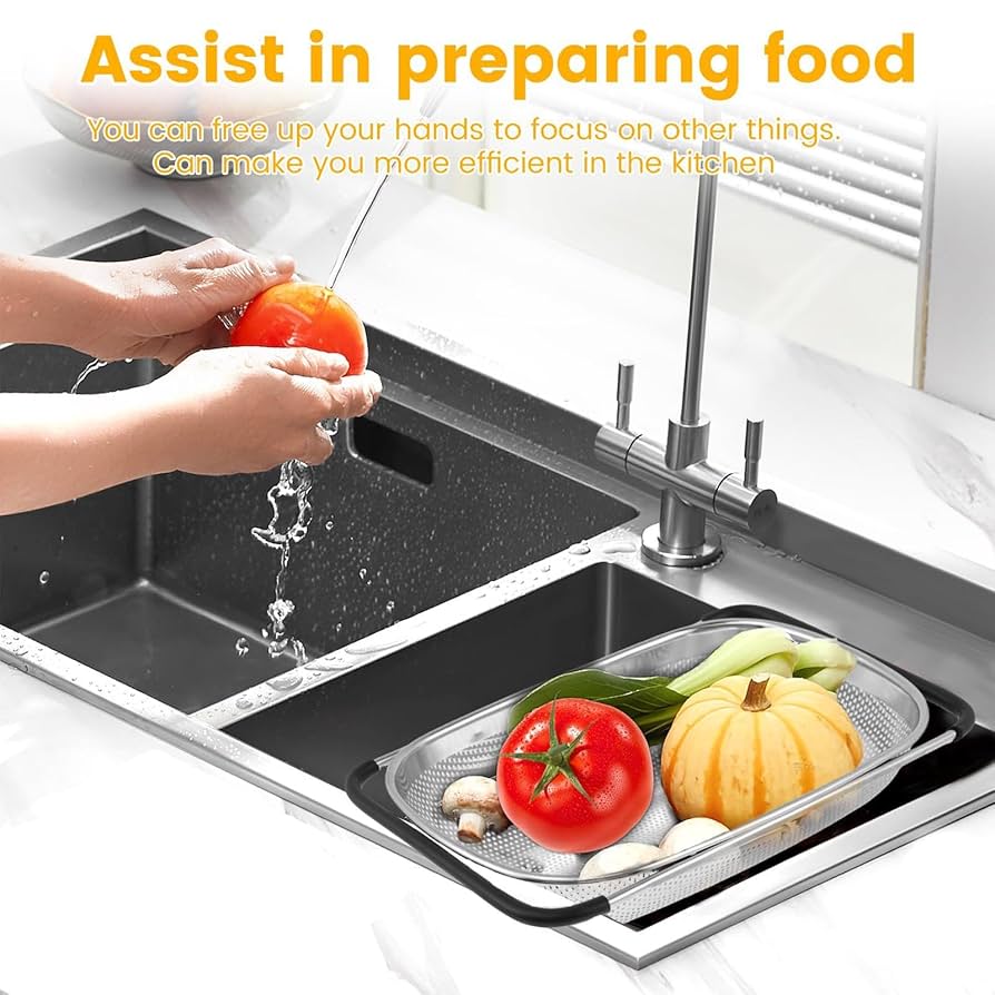 Mega praktisch dieses Edelstahl-Sieb für über die Spüle! Mit 46cm Länge (erweiterbar) bietet es jede Menge Platz zum Abtropfen von Nudeln, Gemüse, Obst oder sogar Geschirr. Aus hochwertigem Edelstahl gefertigt, ist es nicht nur rostfrei und langlebig, sondern auch spülmaschinenfest - super einfach zu reinigen also. Die feinmaschige Struktur hält selbst kleinste Lebensmittelteilchen zurück. Die praktischen Griffe sorgen für sicheren Halt und die ovale Form passt perfekt über die meisten Spülbecken. Ob zum Sieben, Filtern, Trocknen oder Abtropfen - dieses Sieb ist dein neuer bester Freund in der Küche! Nach Gebrauch einfach zusammenklappen und platzsparend verstauen. Ein echter Küchen-Helfer, der dir das Kochen und Spülen deutlich erleichtert. Einfach auflegen und Zeit sparen!