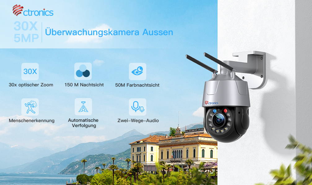 Dein persönlicher Wachdienst für Zuhause! Diese Ctronics 4K Außenkamera liefert gestochen scharfe Bilder bei Tag und Nacht.\n\nMit 5-fachem optischem Zoom siehst du Details in weiter Entfernung. Die Starlight Nachtsicht funktioniert bis 50m - entweder in Farbe oder IR.\n\nDie intelligente KI erkennt Menschen, Fahrzeuge und Haustiere und verfolgt sie automatisch. Bei Alarm aktiviert sie rot-blaue Blitzlichter und eine laute Sirene.\n\nEinfache Installation per 5G/2.4G WLAN, Speicherung auf SD-Karte (bis 256GB), FTP oder NAS. Per App oder PC steuerbar - volle Kontrolle von überall!