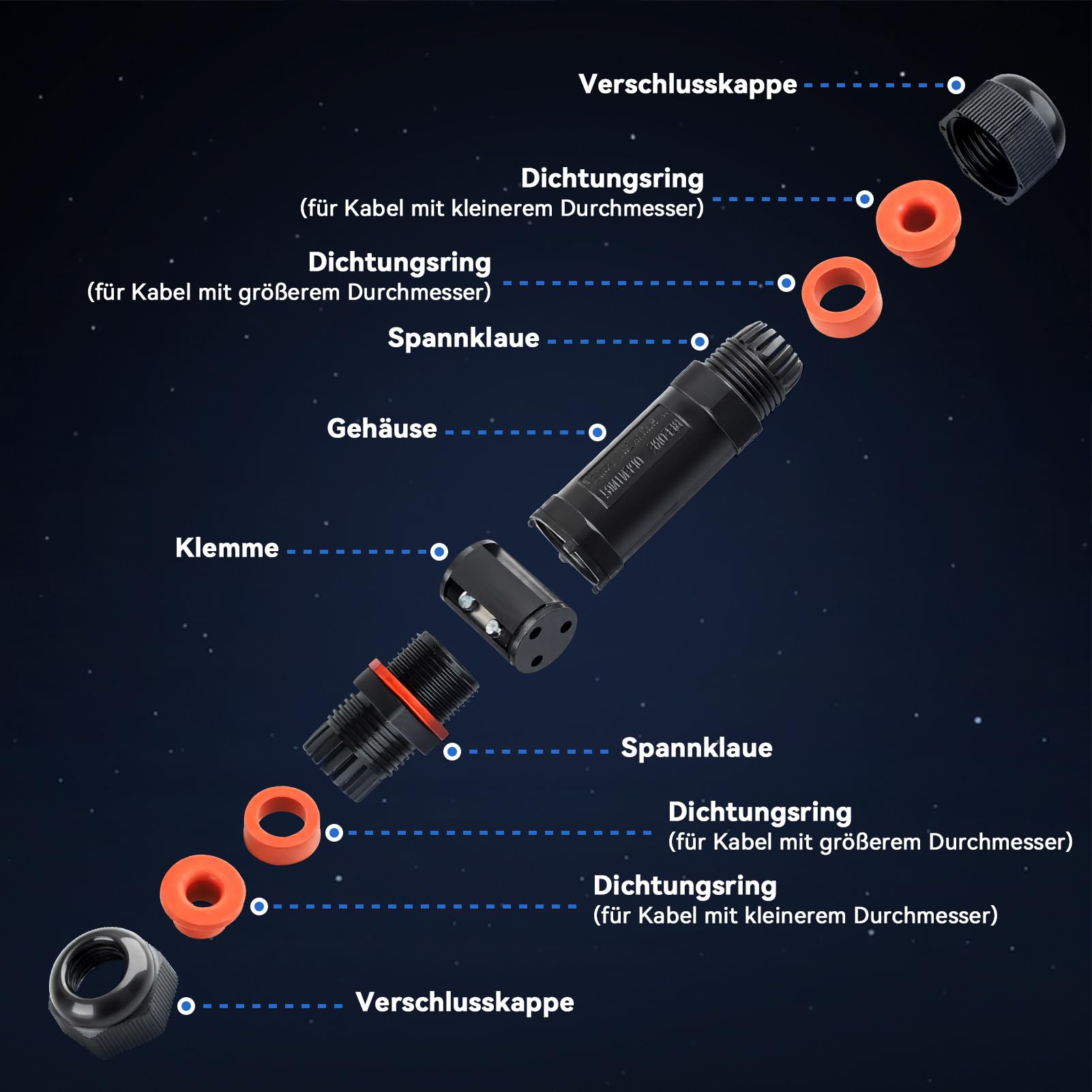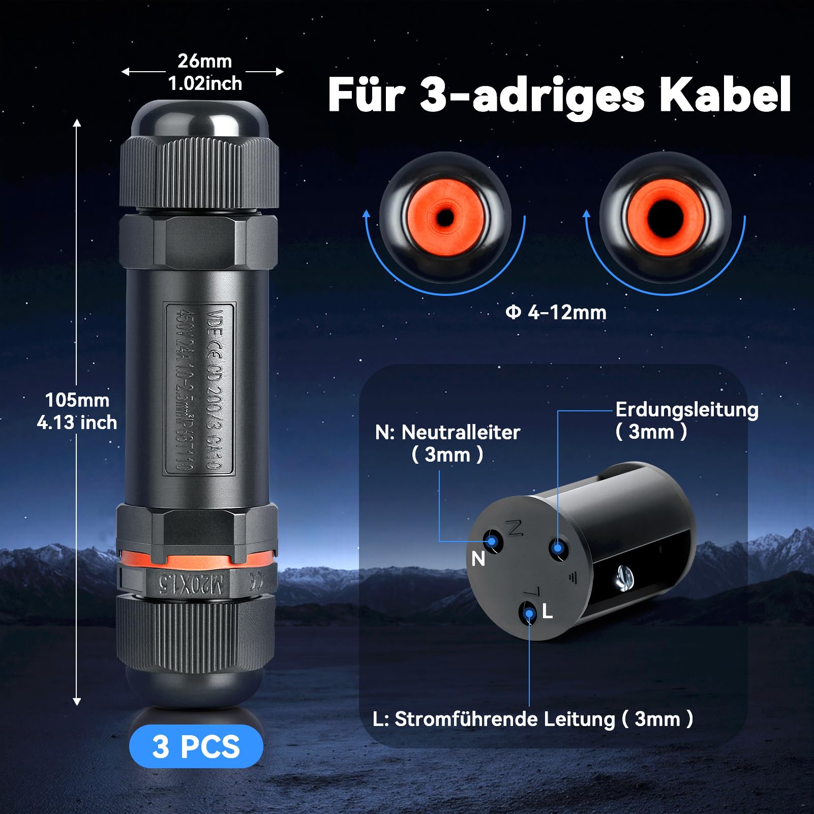 Absolute Sicherheit für deine Kabelverbindungen! Diese 3-poligen Kabelverbinder von SternSinn bieten mit IP68 Zertifizierung maximalen Schutz vor Wasser, Dampf und Staub. Getestet bis zu 150 Stunden in 20 Metern Tiefe - da kannst du dir sicher sein, dass deine Verbindungen trocken und sicher bleiben. Aus hochwertigem PA66-Nylon mit flammhemmenden Eigenschaften, extrem langlebig und stabil von -40°C bis +105°C. Die Installation ist super einfach - kein Spezialwerkzeug nötig! Einfach zerlegen, Kabel anschließen und zusammendrücken. Passt für Kabeldurchmesser von 6-11 mm und Querschnitte von 0,5-2,5 mm². Mit 2 Paar Gummiringen für sicheren Halt. Ideal für LED-Außenleuchten, Straßenlaternen, Tunnellichter, Industriebeleuchtung und alle Außenanwendungen. Im 3er-Set geliefert - perfekt für dein nächstes Elektroprojekt!