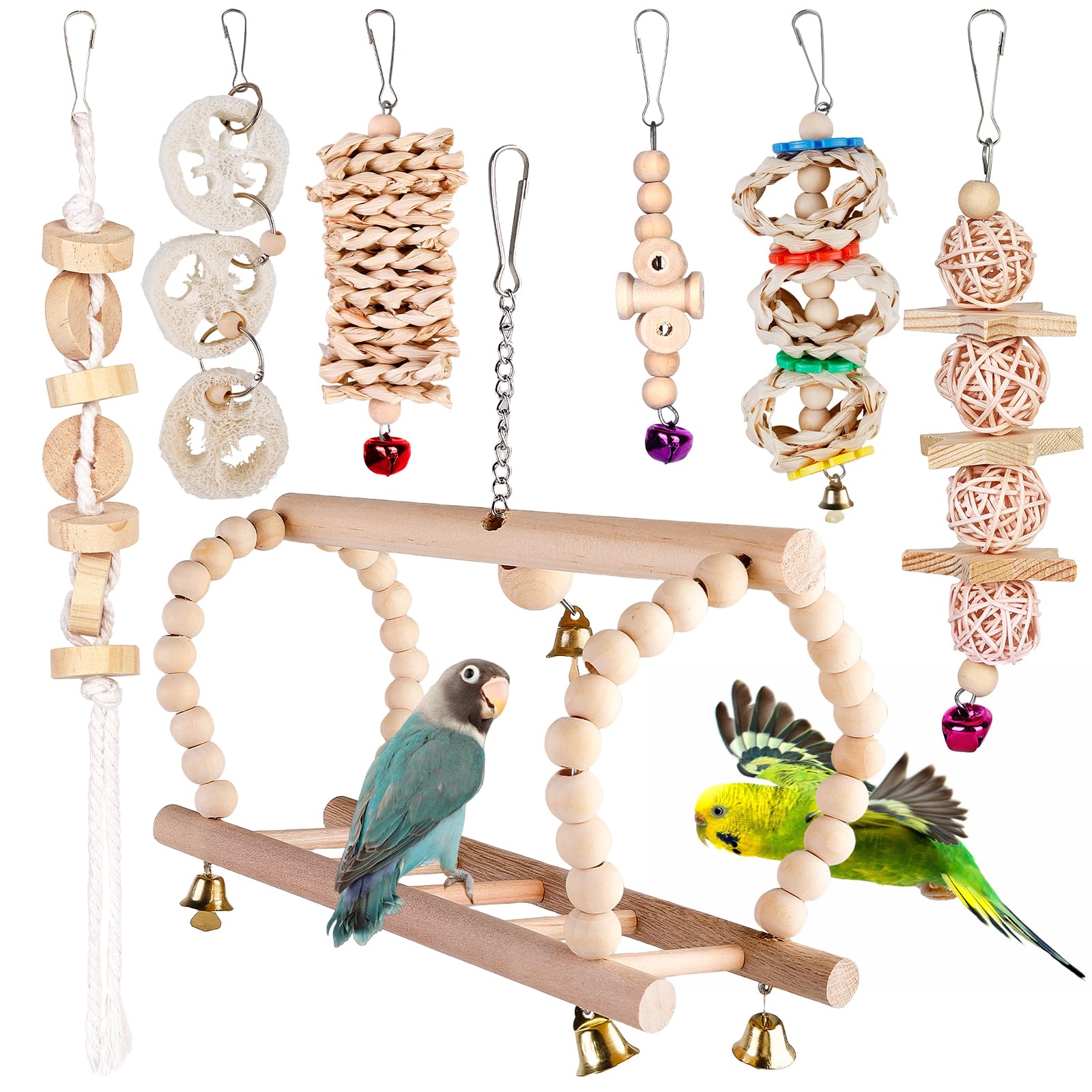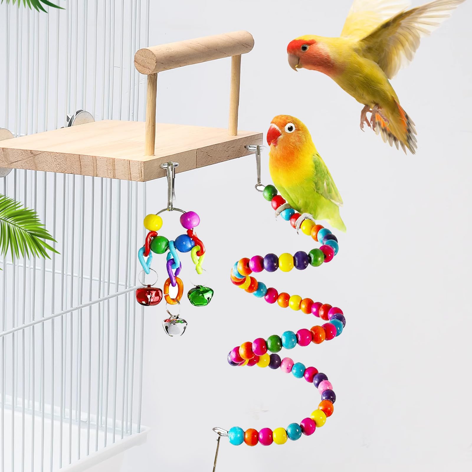 Deine Vögel langweilen sich? Mit diesem 7-teiligen Spielzeug-Set ist Schluss damit! Enthalten ist alles, was gefiederte Freunde glücklich macht: Kokosnuss-Nest mit Leiter, Spiralperlenleiter, Hängematte mit Glocke, Sitzstangenständer, Hängeschnur mit 3 Glocken und 2 Kauspielzeuge. Alles aus natürlichem Holz und Seilen gefertigt - absolut sicher und umweltfreundlich. Die Metallglocken erzeugen fröhliche Töne wenn deine Vögel klettern und fliegen. Perfekt für Wellensittiche, Papageien, Kanarienvögel und andere kleine bis mittelgroße Vögel. Die Spielzeuge sind super einfach mit den Metallhaken im Käfig zu befestigen. So förderst du die natürliche Neugier deiner Vögel und bietest ihnen stundenlangen Spielspaß. Das Kauen und Picken an den Holzstücken ist übrigens auch gut für den Schnabel! Mach deinen Vogelkäfig zur Abenteuerlandschaft - deine Vögel werden's dir danken!