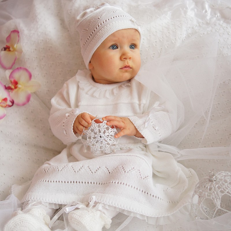 So süß sieht deine kleine Prinzessin aus! Dieses wunderschöne Strickkleid von Cocolina4kids ist perfekt für besondere Anlässe wie Taufen, Familienfeiern oder als Blumenmädchen-Kleid. In reinem Weiß gehalten, strahlt es Eleganz und Unschuld aus. Die Strickqualität ist nicht nur super weich und angenehm auf der Babyhaut, sondern sieht auch einfach entzückend aus. Für jede Jahreszeit geeignet - im Sommer luftig-leicht, im Winter mit einer Strumpfhose darunter. Deine Kleine wird sich wie eine eure Prinzessin fühlen und alle Herzen im Sturm erobern. Einfach anziehen und staunen, wie niedlich dein Baby in diesem zeitlosen Kleidchen aussieht. Perfekt für Fotos und unvergessliche Momente. Ein Must-have für alle, die ihrem Baby etwas ganz Besonderes gönnen wollen!