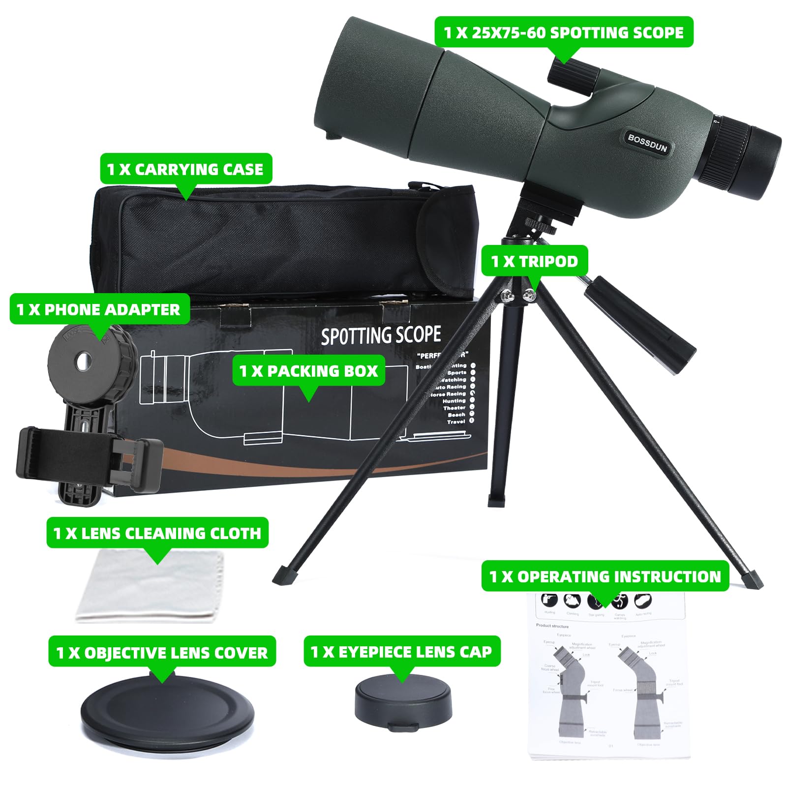 Entdecke die Welt aus der Nähe! Dieses hochwertige Spektiv mit 25- bis 75-facher Vergrößerung und 60 mm Objektivlinse bringt dir die entferntesten Details ganz nah. Perfekt für Vogelbeobachtung, Jagd, Zielscheiben oder einfach für Naturbegeisterte. Das 45 Grad abgewinkelte Okular ermöglicht bequemes Beobachten ohne Nackenverspannungen. Mit vollständig mehrfach beschichteten Linsen und BAK4-Dachprisma liefert es auch bei schlechten Lichtverhältnissen klare, helle Bilder. Das wasserdichte und beschlagfreie Design macht es zum perfekten Begleiter bei jedem Wetter - ob Regen oder Schnee. Im Lieferumfang ist alles enthalten, was du brauchst: verstellbares Stativ, Universal-Handyadapter für Fotos und Videos, Reinigungstuch und Tragetasche. Der ausziehbare Sonnenschutz reduziert Blendung für optimale Sicht. Ob beim Wandern, Camping oder am heimischen Fenster - mit diesem Spektiv verpasst du kein Detail mehr. Einfach aufbauen, scharfstellen und staunen, was es alles zu entdecken gibt!