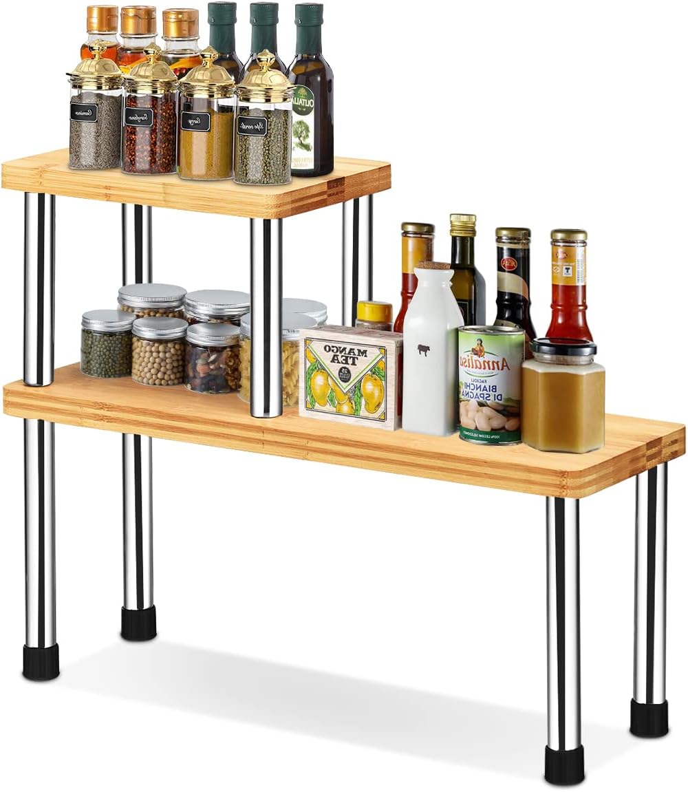Diese zwei Bambus-Organizer bringen endlich Ordnung in deine Küchenschränke! Super praktisch: Sie sind erweiterbar von 32,3cm auf 56,4cm Länge und passen sich so jedem Schrank an. Aus hochwertigem Bambus - stabil, langlebig und sieht dazu noch gut aus. Mit zwei Ebenen hast du viel Stauraum für Gewürze, Tassen, Vorräte oder Putzmittel. Ohne Montage einfach reinschieben und sofort nutzen. Auch super fürs Badezimmer oder Schlafzimmer geeignet. Die Maße von 31,5-60,8cm Länge, 22,5cm Breite und 11,5cm Höhe sind ideal für Standard-Schränke. Einfach genial für mehr Ordnung ohne großen Aufwand!