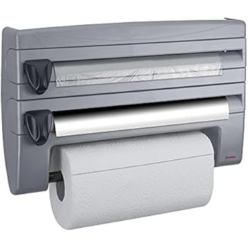 Endlich Ordnung in der Küche! Dieser praktische 3-in-1-Spender für Frischhaltefolie, Alufolie und Küchenrolle macht Schluss mit Chaos. Einfach an der Wand montieren - ganz ohne Bohren! Die scharfen Klingen sind sicher versteckt und geben trotzdem perfekte Schnittkanten. Mit praktischem Stauraum oben für Gewürze und eingebauter Rollenbremse für einhändiges Abreißen. In modernem Grau-Weiß passt er zu jedem Küchendesign. Spart Platz und sieht dabei noch gut aus - was will man mehr? Ein echter Küchenhelfer, der das Leben leichter macht!