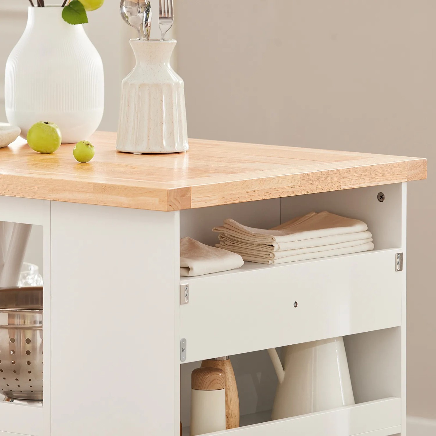 Die Kombination aus weiß und naturholzfarben passt zu fast jedem Einrichtungsstil. Ob als zusätzliche Arbeitsfläche beim Kochen, als Frühstücksinsel oder zur Aufbewahrung - diese Kücheninsel wird schnell zu deinem Lieblingsmöbelstück!