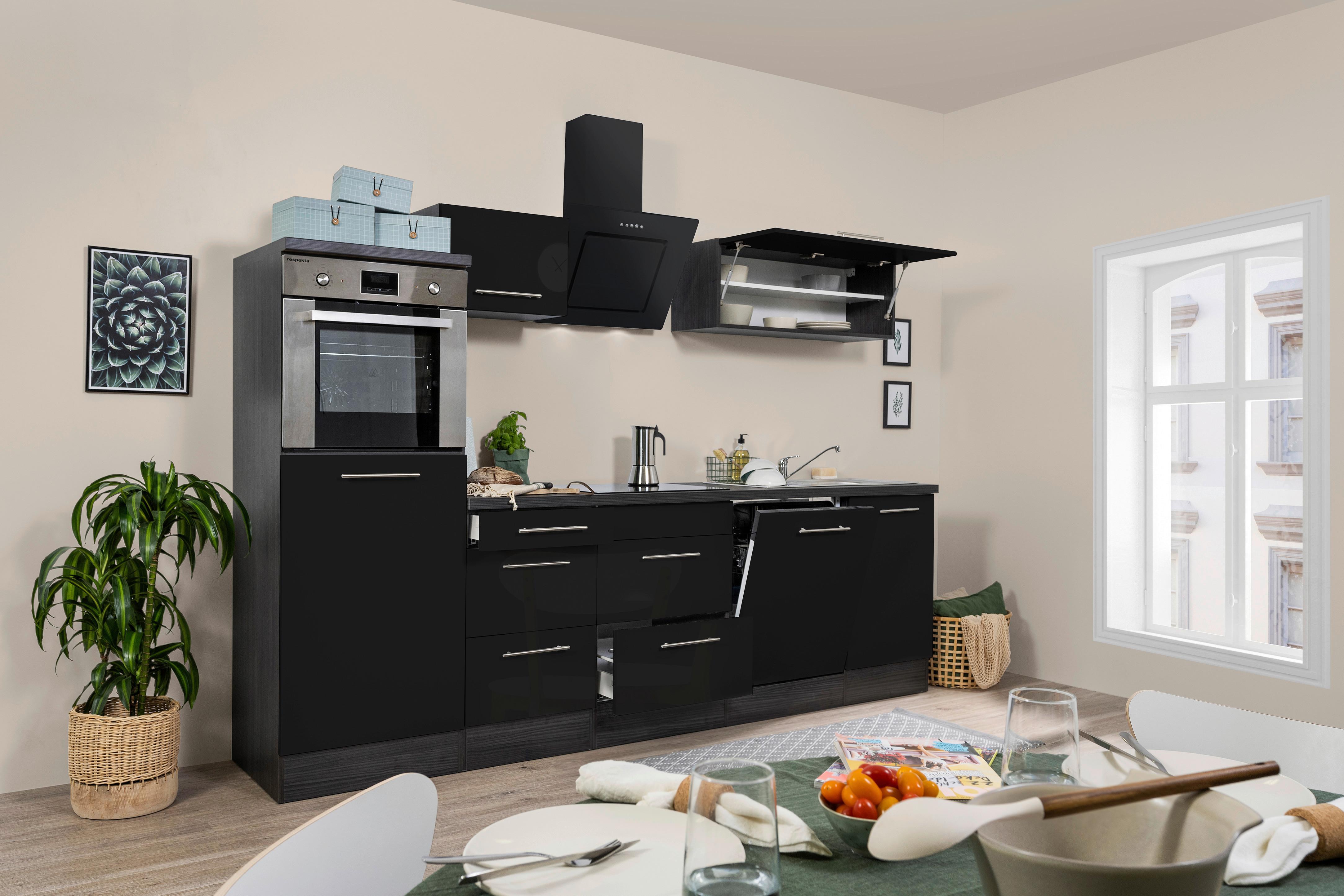Respekta Malia Küchenzeile 280cm Schwarz - Komplettküche Mit Soft-Close & Einbauspüle
