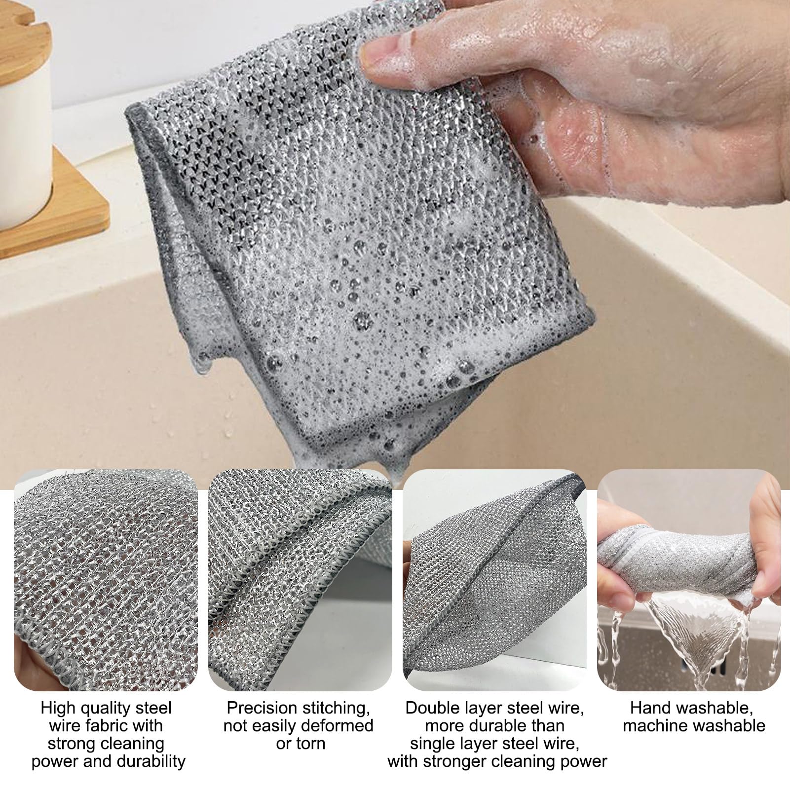 Revolution in der Küchenreinigung! Diese 12 Draht-Geschirrtücher kombinieren kratzfeste Stahlseite mit weichem Mikrofaser-Tuch. Entfernen selbst hartnäckige Verschmutzungen, ohne Oberflächen zu beschädigen. Perfekt für Töpfe, Pfannen, Herd und Spüle. Maße 17,8x20,3 cm für optimale Handhabung. Beidseitig verwendbar - Stahlseite für Krusten, Mikrofaser für normale Reinigung. Hochwertige Steppnaht verhindert Ausfransen. Einfach ausspülen und trocknen lassen - wiederverwendbar über lange Zeit. Sag goodbye zu zerkratztem Geschirr und hallo zu makellosem Glanz!