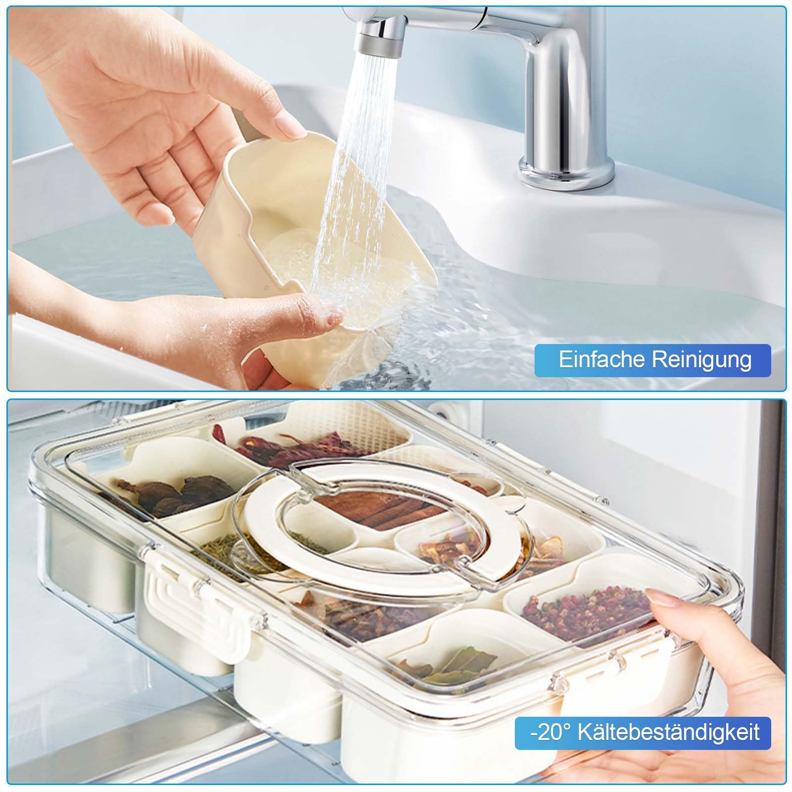Diese Snackbox ist einfach genial praktisch! Mit 8 verschiebbaren Fächern kannst du verschiedene Snacks, Obst, Nüsse oder Süßigkeiten perfekt getrennt aufbewahren. So vermischen sich die Geschmäcker nicht und alles bleibt schön ordentlich. Der Deckel schließt dicht ab und hält deine Snacks frisch. Die beiden klappbaren Griffe machen die Box super tragbar - ideal für unterwegs, Picknicks, Partys oder Büro. Hergestellt ist sie aus hochwertigem PP-Material, langlebig und immer wieder verwendbar. Im Lieferumfang sind sogar 4 Gabeln und 4 Löffel enthalten - alles, was du für einen Snack-Spaß brauchst! Wichtig: Die Box ist nicht mikrowellengeeignet und sollte nicht in die Spülmaschine. Einfach von Hand mit warmem Wasser reinigen. Perfekt für Kindergeburtstage, Filmabende, Ausflüge oder einfach für den täglichen Gebrauch zu Hause. Mit dieser Box wird Snacken zum organisierten Vergnügen!