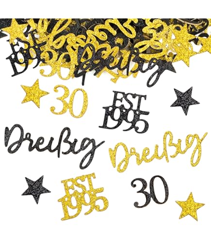 Bye bye 20er, hallo 30er! Dieses coole Konfetti-Set macht jede 30. Geburtstagsfeier zum unvergesslichen Event. 100 Stück in Schwarz und Silber mit Motiven wie 'Rip Twenties', 'Rip 20s', Zahl 30, Grabsteine und Skelette. Aus glitzerndem Karton gefertigt, der im Licht toll funkelt. Perfekt für Tischdekoration, als Füllmaterial für Geschenkboxen oder klare Flaschen, für Kuchenverzierung oder in Heliumballons. Egal ob für Männer oder Frauen - dieses Konfetti bringt die richtige Portion Humor auf jede Party. Achtung: Wegen Verschluckungsgefahr nicht ohne Aufsicht von Erwachsenen verwenden! Die Motive sind sauber ausgestanzt und reißen nicht ein. Mach deine 'Death to my 20s' Party zum absoluten Highlight - deine Gäste werden begeistert sein!