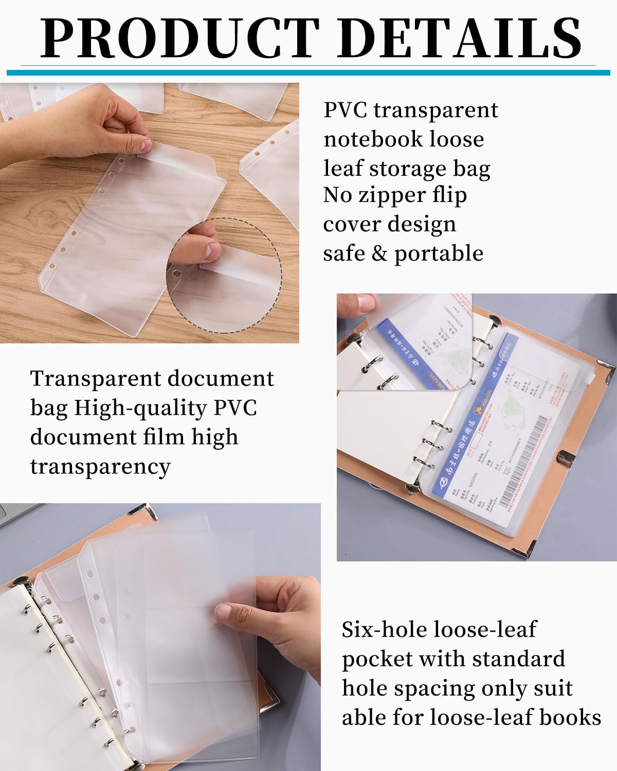 Durch das transparente Design siehst du sofort, was sich in der Tasche befindet. Lose-Blatt-Design ermöglicht flexibles Hinzufügen oder Entfernen von Seiten.