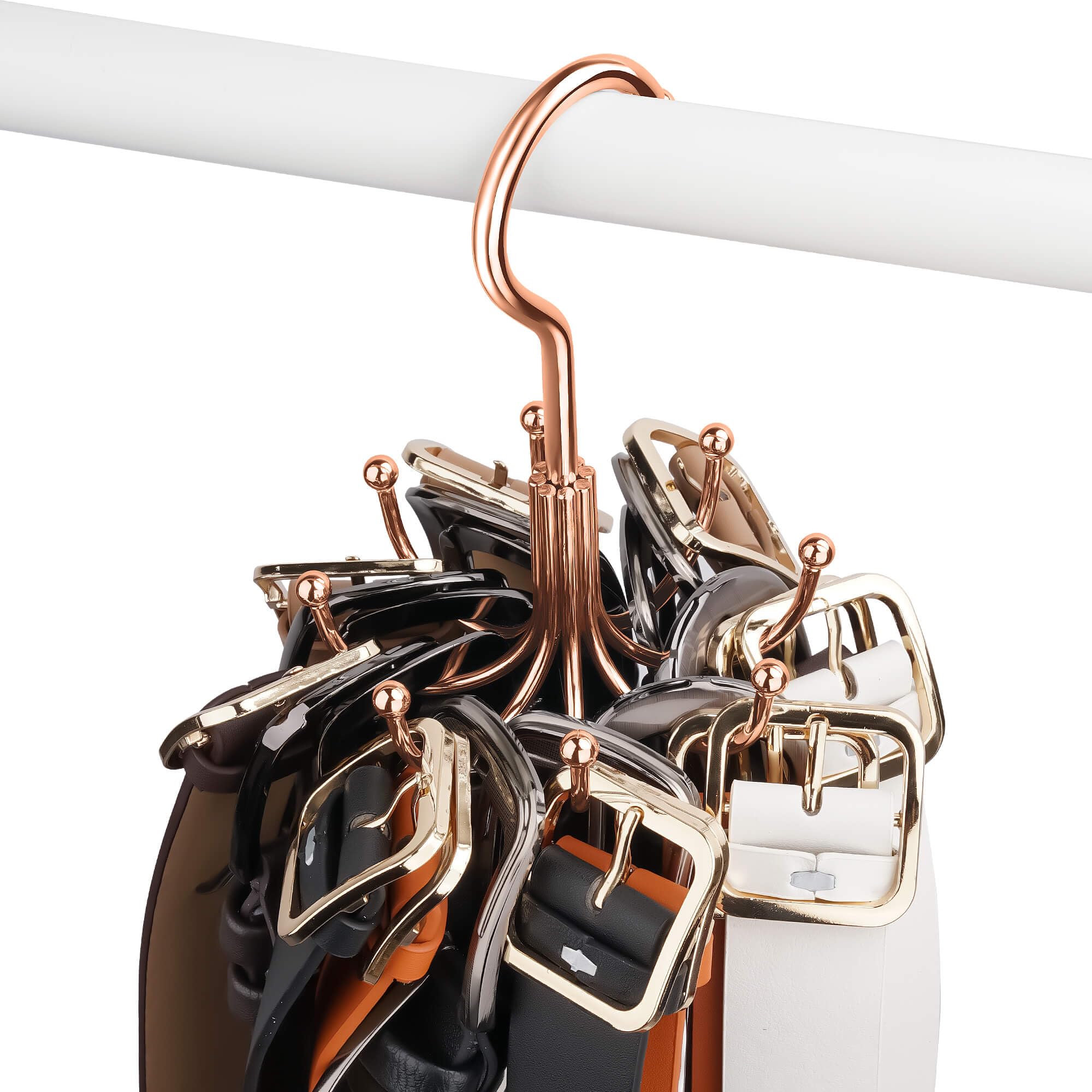Endlich Ordnung im Schrank! Dieser ZEDODIER Gürtelbügel ist die Lösung für all deine Accessoires! Mit 8 Haken pro Bügel kannst du bis zu 24 Gürtel unterbringen (je 3 pro Haken)! Aber nicht nur Gürtel: Perfekt für BHs, Tanktops, Krawatten, Schals, Geldbörsen - alles was rumliegt! Aus verdicktem Metall in schickem Roségold - super stabil und kippt nicht! Alles ist sichtbar und griffbereit - kein Suchen mehr! Spart mega Platz im Schrank und sieht dabei noch stylisch aus! Im 2er-Pack - ideal für Doppeltüren oder verschiedene Schrankabteile! Umweltfreundlich produziert - kein Müll! Mach deinen Schrank endlich ordentlich!