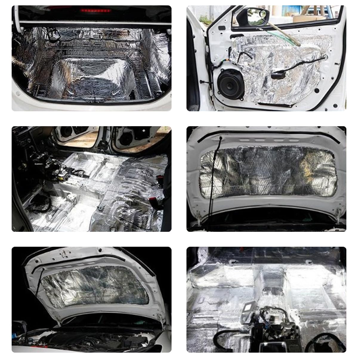 Aus Aluminiumfolie mit Gummischaum - isoliert auch gegen Wärme. Selbstklebend, einfach Schutzpapier abziehen und an Türen, Motorhaube oder Dach kleben.