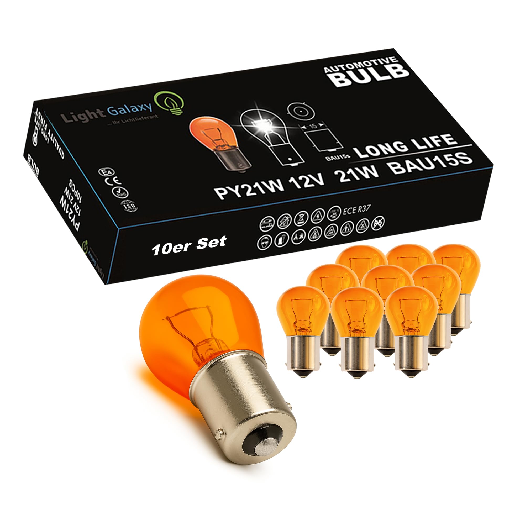 Immer gut sichtbar unterwegs! Diese 10 Blinkerlampen im Set sorgen für klare Signale im Straßenverkehr. Mit BAU15s Bajonettsockel (Pins versetzt um 150°) passen sie in viele PKW, Anhänger, Motorräder und Scooter. 12V, 21W, orange - perfekt abgestimmt für Blinker und Signalleuchten. ECE R37 zugelassen und damit straßentauglich in ganz Europa. Einfacher, werkzeugloser Wechsel dank Bajonettverschluss. Die 500 Lumen Helligkeit sorgt für beste Sichtbarkeit. Mit 500 Stunden Lebensdauer eine langlebige Lösung. Im praktischen 10er-Set immer Ersatz parat!