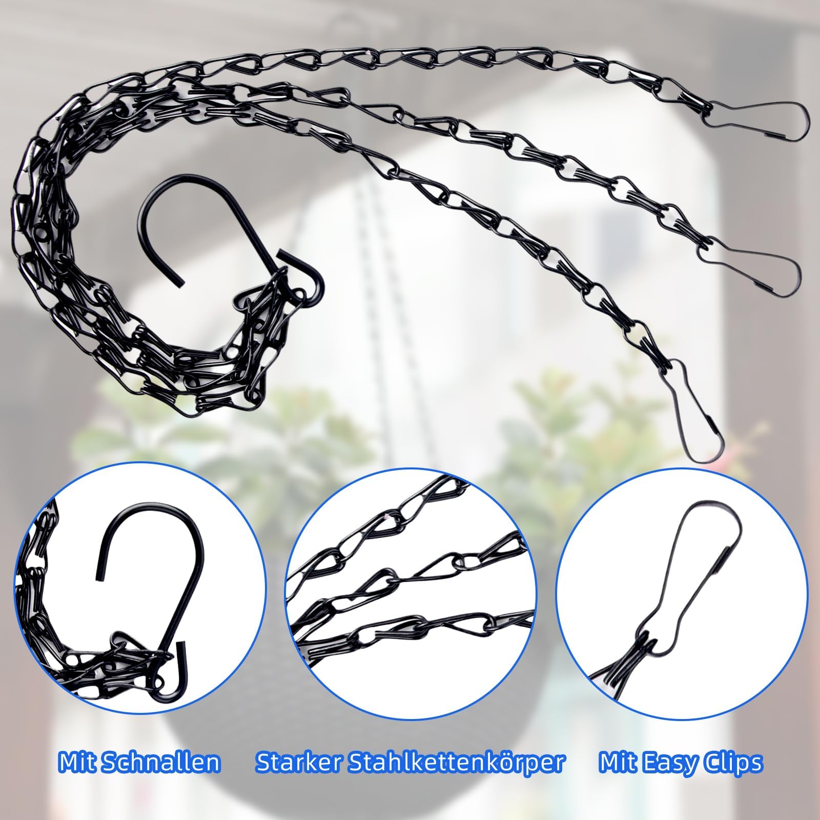 Bring deine Pflanzen in die Höhe! Diese 6 schwarzen Metallketten verwandeln jeden Blumentopf in eine elegante Hängeampel. Perfekt für drinnen und draußen. \\n\\nTechnische Details: \\n• Material: Galvanisiertes Metall \\n• Farbe: Schwarz (elektrophoretisch beschichtet) \\n• Gesamtlänge: 40 cm pro Kette \\n• Mit S-Haken \\n• Rost- und korrosionsbeständig \\n\\nEinfache Montage: Die S-Haken lassen sich mit Werkzeugen öffnen und schließen. Du kannst die Ketten einzeln oder kombiniert verwenden und die Länge durch Hinzufügen/Entfernen von Gliedern anpassen. \\n\\nEinsatzmöglichkeiten: \\n• Blumentöpfe und Pflanzenkörbe \\n• Vogelkäfige und Vogelhäuschen \\n• Windspiele und Laternen \\n• Deko-Elemente \\n• Werbetafeln \\n\\nDie dreieckige Aufhängung mit drei Ketten sorgt für maximale Stabilität. So hängen deine Pflanzen sicher und sehen dabei noch stylisch aus. \\n\\nTipp: Kombiniere mehrere Ketten für größere Töpfe oder verwende sie einzeln für leichtere Pflanzen. Dein Zuhause wird zum grünen Paradies!