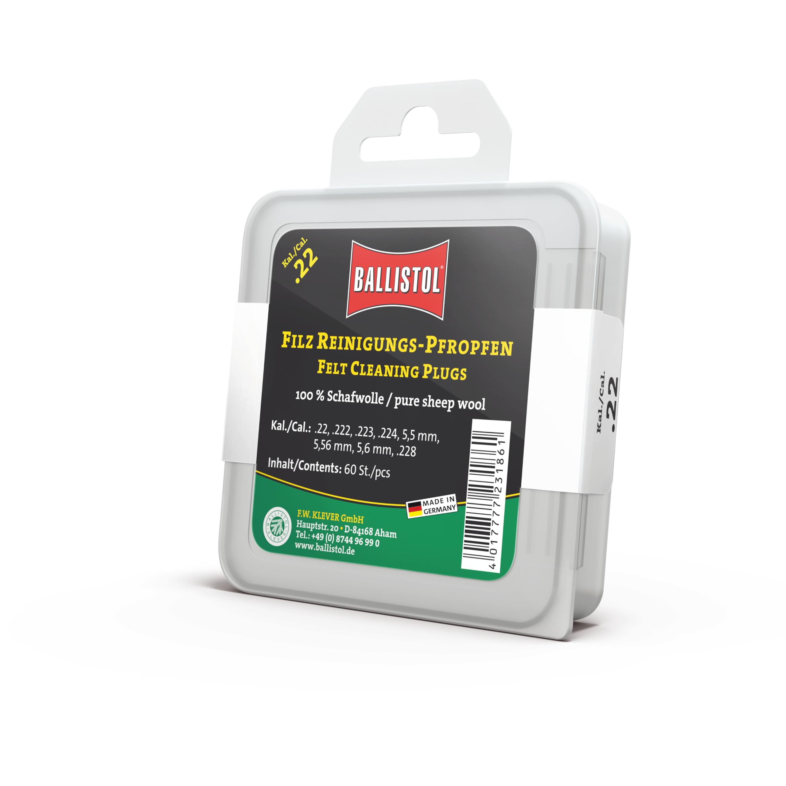 Super praktisch diese Filzreinigungspfropfen von Ballistol! 300 Stück im Pack - da hast du lange was von. Perfect für Luftdruckwaffen mit Kaliber .17, 4mm M20, 4,5mm oder .177. Einfach durch den Lauf schießen - kein nerviges Putzstock-Gefummel nötig! Aus 100% reiner Schafswolle, ohne irgendwelche Füllstoffe. Für extra Rostschutz kannst du den Filz vorher mit etwas Waffenöl tränken. Zusammen mit Balsin Schaft-Öl und Gunex Waffen-Öl hast du die komplette Waffenpflege im Griff. Ballistol ist ne deutsche Traditionsmarke seit 1874 - da weißt du dass die Qualität stimmt. Einfach in den Lauf stecken, schießen, und schon ist deine Waffe sauber! Spart Zeit und Nerven beim Reinigen. Perfect für alle Sportschützen und Jäger die Wert auf einfache, effektive Waffenpflege legen. Einfach bestellen und die nächste Reinigung wird zum Kinderspiel!