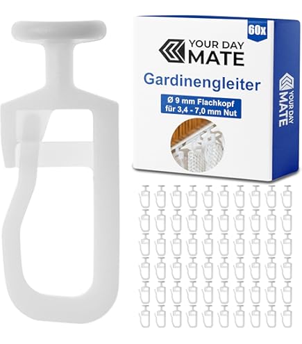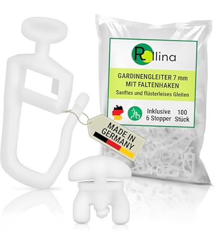 Perfekte Gardinenfalten ganz einfach! Die rewagi Gardinengleiter mit Rundkopf (7 mm) machen deine Vorhänge zum Hingucker. Das Set enthält 100 hochwertige Gleiter aus gleitfähigem Kunststoff - genug für mehrere Gardinen. Die weiße Farbe passt zu den meisten Gardinenschienen und -stangen und fällt dezent auf. Mit dem Innenlauf von 4 mm passen die Haken auf alle handelsüblichen Schienensysteme. Die Gleiter sind wasch- und reinigungsbeständig - einfach im Wäschenetz in die Maschine geben und sie sehen wie neu aus! Besonders praktisch: Die Faltenlegehaken sorgen für eine gleichmäßige, schöne Faltenbildung ohne langes Arrangieren. Einfach die Gardine einhängen, aufschieben - fertig ist die perfekte Dekoration! Hergestellt in Deutschland und überzeugen durch ihre Langlebigkeit und hohe Tragkraft. Verleihe deinem Zuhause mit diesen praktischen Helfern ganz easy das gewisse Etwas - ob im Wohnzimmer, Schlafzimmer oder Büro!