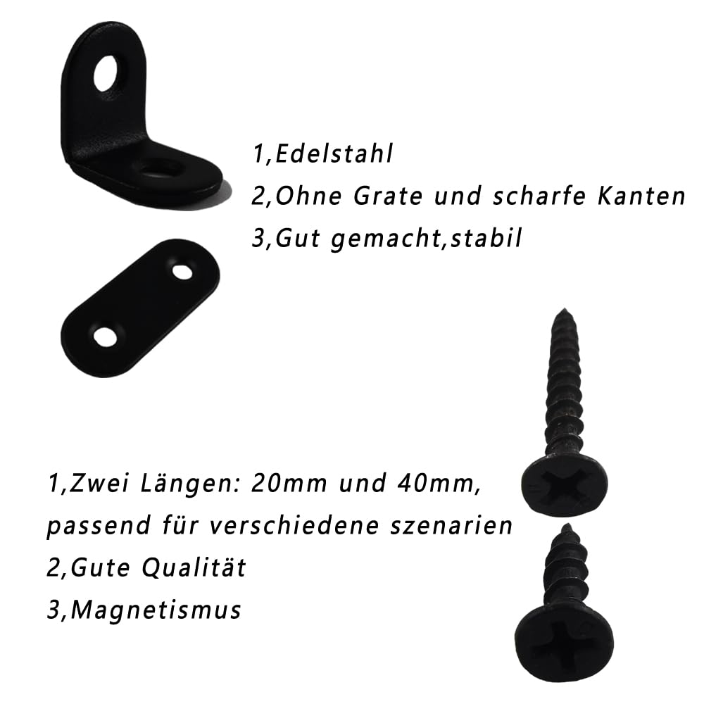 Endlich stabile Möbel und Holzkonstruktionen! Mit diesen 20 robusten Flachverbindern aus kaltgewalztem Stahl machst du deine Möbel richtig stabil. Die schwarzen Winkelverbinder haben jeweils 2 Löcher (5mm Durchmesser) und kommen inklusive 40 Schrauben - alles was du für eine sichere Montage brauchst. Einfach an der gewünschten Stelle positionieren und mit dem Schraubendreher festziehen. Die selbstschneidenden Schrauben machen die Sache besonders einfach! Perfekt für Stühle, Tische, Betten, Regale oder sogar Gartenmöbel. Die Verbinder sind versenkt, sodass nach der Montage keine scharfen Kanten hervorstehen. Mit der schwarzen Beschichtung sehen sie nicht nur gut aus, sondern sind auch rostbeständig. Ob du neue Möbel baust oder alte reparieren möchtest - mit diesen Verbindern klappt's bestimmt! Übrigens: Auch für Hobelnähte, Fugen und Risse super geeignet.