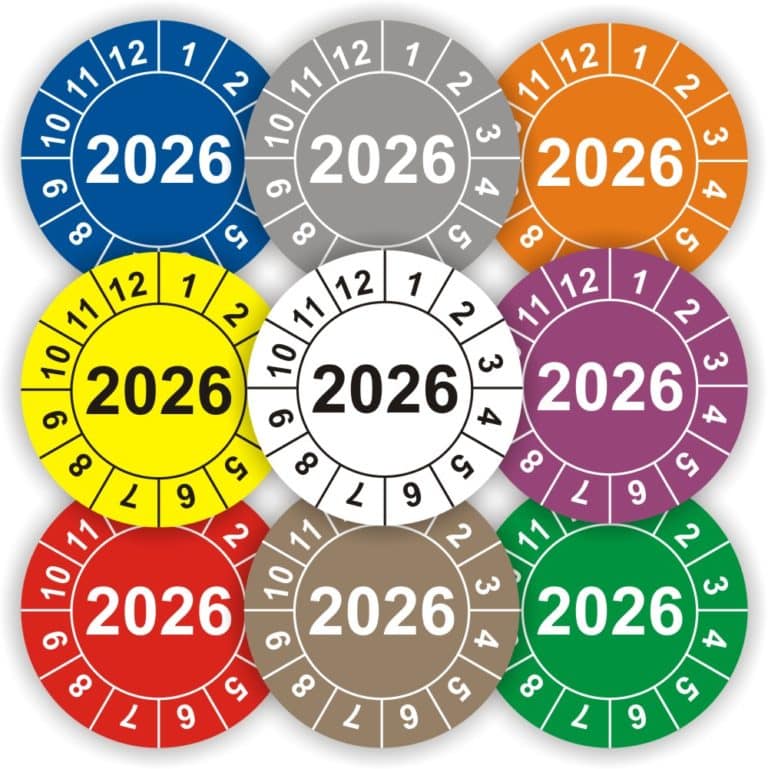 Für alle, die regelmäßige Prüfungen dokumentieren müssen: Diese Jahresprüfplaketten für 2026 sind genau das Richtige! Perfekt für Maschinen, Geräte und Anlagen.\n\nTechnische Spezifikationen:\n• Größe: 30 mm Durchmesser\n• Menge: 200 Stück auf Rolle\n• Material: PP-Folie\n• Druck mit lösemittelhaltiger Tinte\n• Wasser- und UV-beständig\n\nVorteile dieser Etiketten:\n• Extradicker Spezialkleber - hält auch auf schwierigen Oberflächen\n• Wetterfest - für Innen- und Außenbereich\n• Mit praktischer Spenderbox\n• Made in Germany - hohe Qualität\n\nOptional erhältlich:\n• Schutzlaminat gegen Chemikalien und Öle\n• Verschiedene Grundplaketten\n• Spezielle Stifte zum Beschriften\n\nEinfach von der Rolle abziehen und aufkleben - die Prüfung ist dokumentiert! Perfekt für Werkstätten, Industrie und Handwerk. Sofort lieferbar als Lagerware!