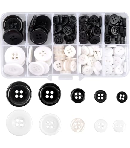 Das ultimative Knopf-Set für alle Nähprojekte! 120 schwarze Harzknöpfe in 6 praktischen Größen von 10mm bis 30mm. Jeder Knopf mit 4 Löchern für extra Halt beim Annähen. Aus hochwertigem Harz - verschleißfest, hitzebeständig und farbecht. Perfekt für Kleider, Mäntel, Hemden oder DIY-Projekte. Komplett mit praktischer Aufbewahrungsbox mit Fächern für jede Größe - so findest du immer den richtigen Knopf! Waschmaschinen- und Trocknerfest. Ob für Reparaturen oder kreative Handarbeiten - dieses Set hat für jedes Projekt den passenden Knopf. Ein Must-have für jede Nähbox!