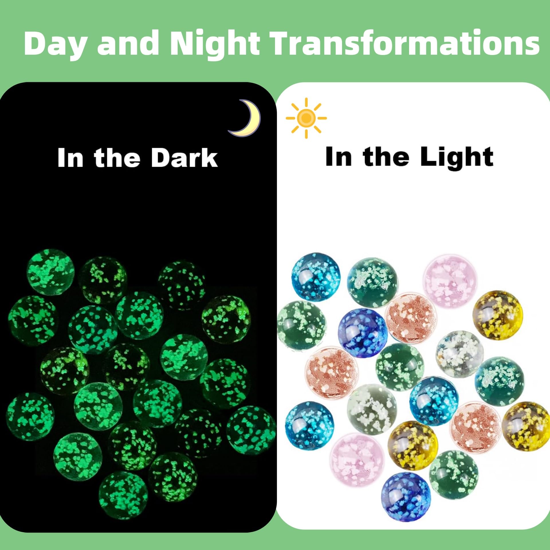 Magie für dein Zuhause! Diese 20 bunten Glasmurmeln leuchten im Dunkeln und verzaubern jeden Raum. Einfach vorher natürlichem oder künstlichem Licht aussetzen und schon speichern sie das Licht und geben es später wieder ab - ganz ohne Aufladen oder Batterien! Mit 14 mm Durchmesser sind sie perfekt für Kinderhände und verschiedene Spiele. Es gibt 10 verschiedene Farben, sodass für jeden Geschmack etwas dabei ist. Super für klassische Murmelspiele, aber auch als Deko-Element in Vasen, als Tischdekoration oder für kreative DIY-Projekte. Hergestellt aus robustem Glas mit glatter Oberfläche - sicher und langlebig. Fördert die Kreativität und Feinmotorik von Kindern, während Erwachsene sich an der magischen Atmosphäre erfreuen. Ein tolles Geschenk für Kindergeburtstage, als Mutmurmeln für den ersten Schultag oder einfach als kleines Mitbringsel. Packung mit 20 Stück - genug für Spiele, Dekoration und zum Verschenken!