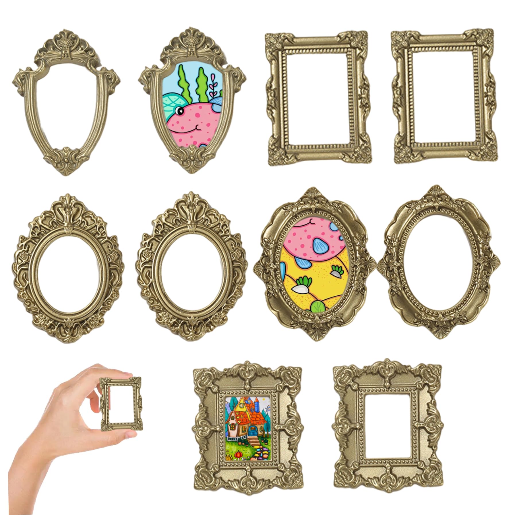 Wunderschöne Mini-Bilderrahmen im Vintage-Gold-Design! Dieses 10-teilige Set enthält 5 verschiedene Stile für abwechslungsreiche Deko-Möglichkeiten. Aus hochwertigem Harz gefertigt - leicht aber dennoch stabil und langlebig.