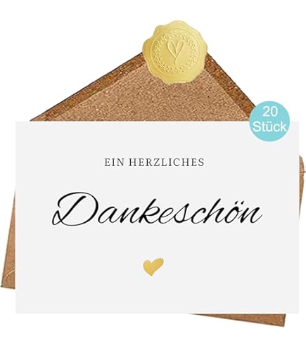 Zeig deine Wertschätzung mit diesen wunderschönen Dankeskarten! Das Set enthält 20 Karten im Format 9x14 cm aus hochwertigem 300g/m² Karton, plus 20 Kraftpapier-Umschläge und 20 dekorative Siegelaufkleber. Jede Karte trägt den liebevollen Spruch 'Dies ist nur eine kleine Karte für ein ganz großes Dankeschön'. Die Rückseite bietet viel Platz für deine persönliche Nachricht. Perfekt für Kollegen, Lehrer, Freunde oder Familie - ob nach der Hochzeit, zum Geburtstag oder einfach mal so als nette Geste. Die Karten fühlen sich richtig hochwertig an und machen jedes Dankeschön zu etwas Besonderem. Mit den beiliegenden Siegelaufklebern kannst du die Umschläge noch persönlicher gestalten. Einfach reinschreiben, zukleben und Freude verschenken!