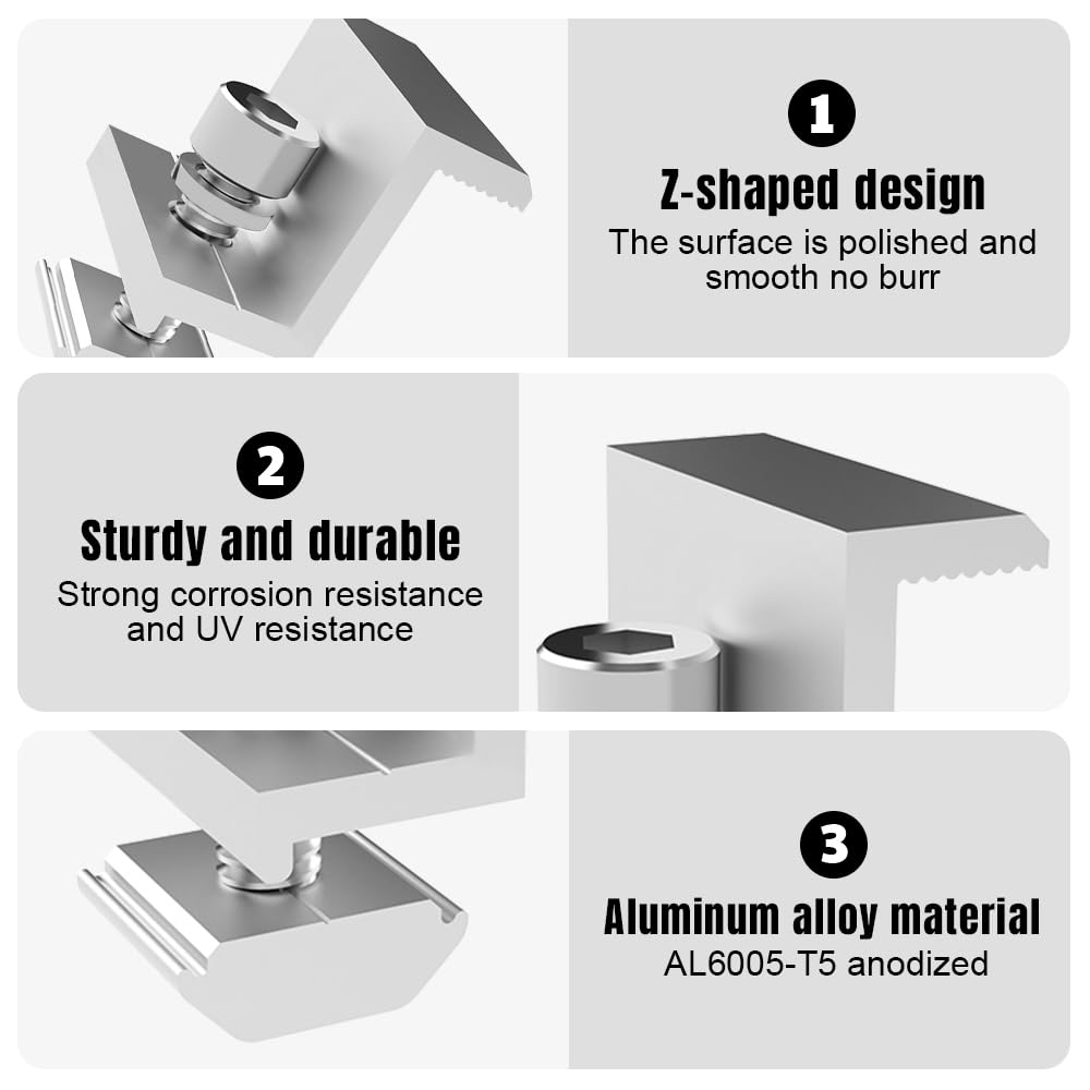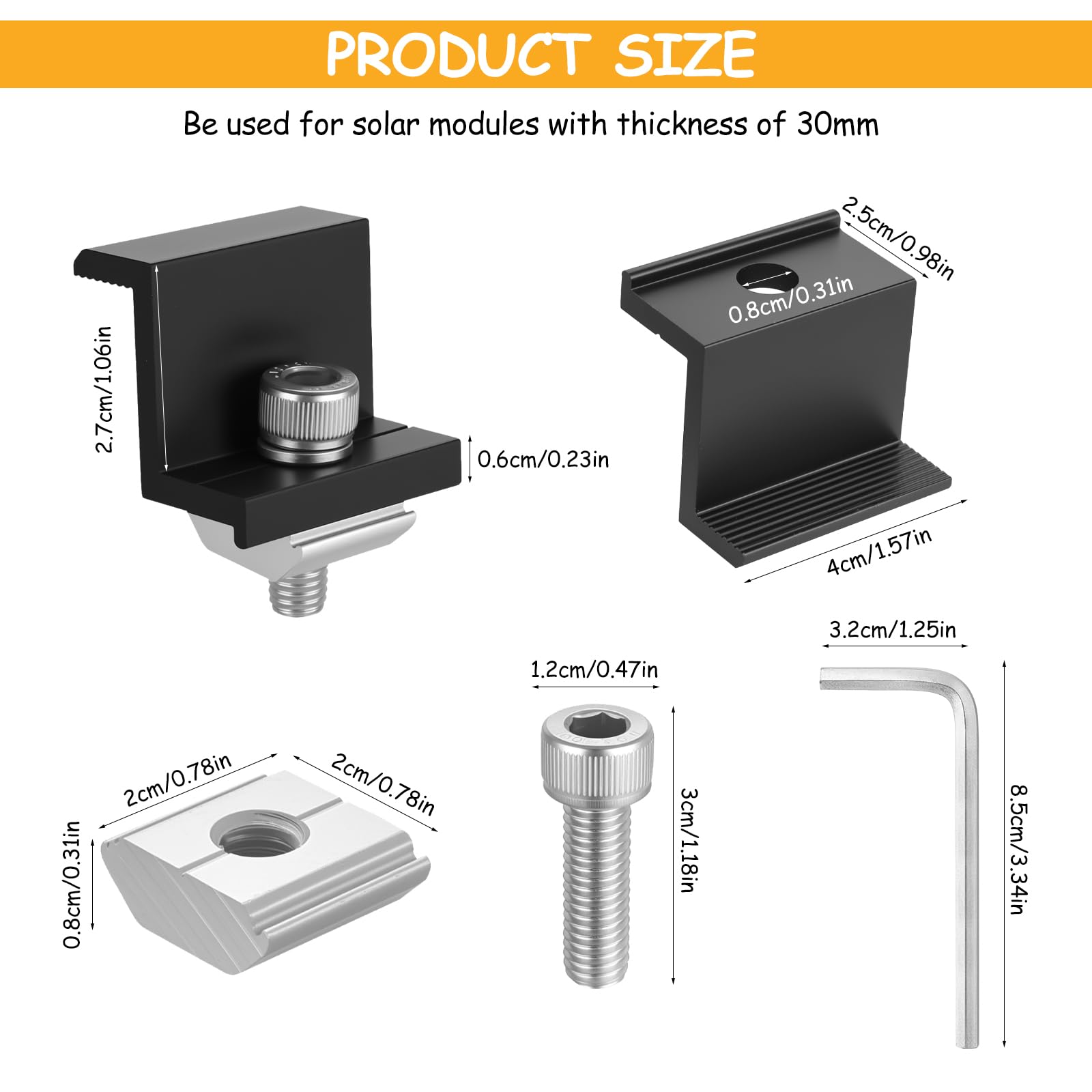 Boah, wenn du Solarpanels montieren willst, brauchst du auf jeden Fall diese Endklemmen! Das 8-teilige Set ist perfekt für dein Solarprojekt - ob auf dem Dach, am Wohnmobil oder auf dem Boot. \\n\\nDie Klemmen sind aus hochwertiger Aluminiumlegierung - das bedeutet: mega stabil, rostfrei und absolut wetterbeständig! Egal ob bei Hitze, Kälte oder Regen - die halten was aus. \\n\\nTechnische Daten: • Für 30mm Solarpanels • 8 Stück im Set • Material: Aluminiumlegierung • Farbe: Schwarz \\n\\nDas Z-förmige Design ist richtig clever: Es passt perfekt zu den Solarpanels und gibt bombenfesten Halt. Die Oberfläche ist präzise verarbeitet, ohne scharfe Kanten - super sicher in der Handhabung! \\n\\nMontage? Ganz easy! Die Klemmen haben bereits vorgebohrte Löcher. Einfach mit den mitgelieferten Schrauben und Muttern an der Schiene befestigen - schon sitzt alles bombenfest. \\n\\nPerfekt für: • Privathaushalte • Gewerbliche Solaranlagen • Wohnmobile • Boote • Gartenhäuschen \\n\\nMit 8 Stück hast du genug Material für mehrere Panels oder ein größeres Projekt. Die Qualität ist echt professionell - da macht dir auch starke Belastung durch Wind oder Wetter nichts aus. \\n\\nAlso, wenn du deine Solaranlage sicher und dauerhaft montieren willst, sind diese Endklemmen absolut empfehlenswert. Da sparst du dir teures Profi-Zubehör und kriegst trotzdem Top-Qualität!