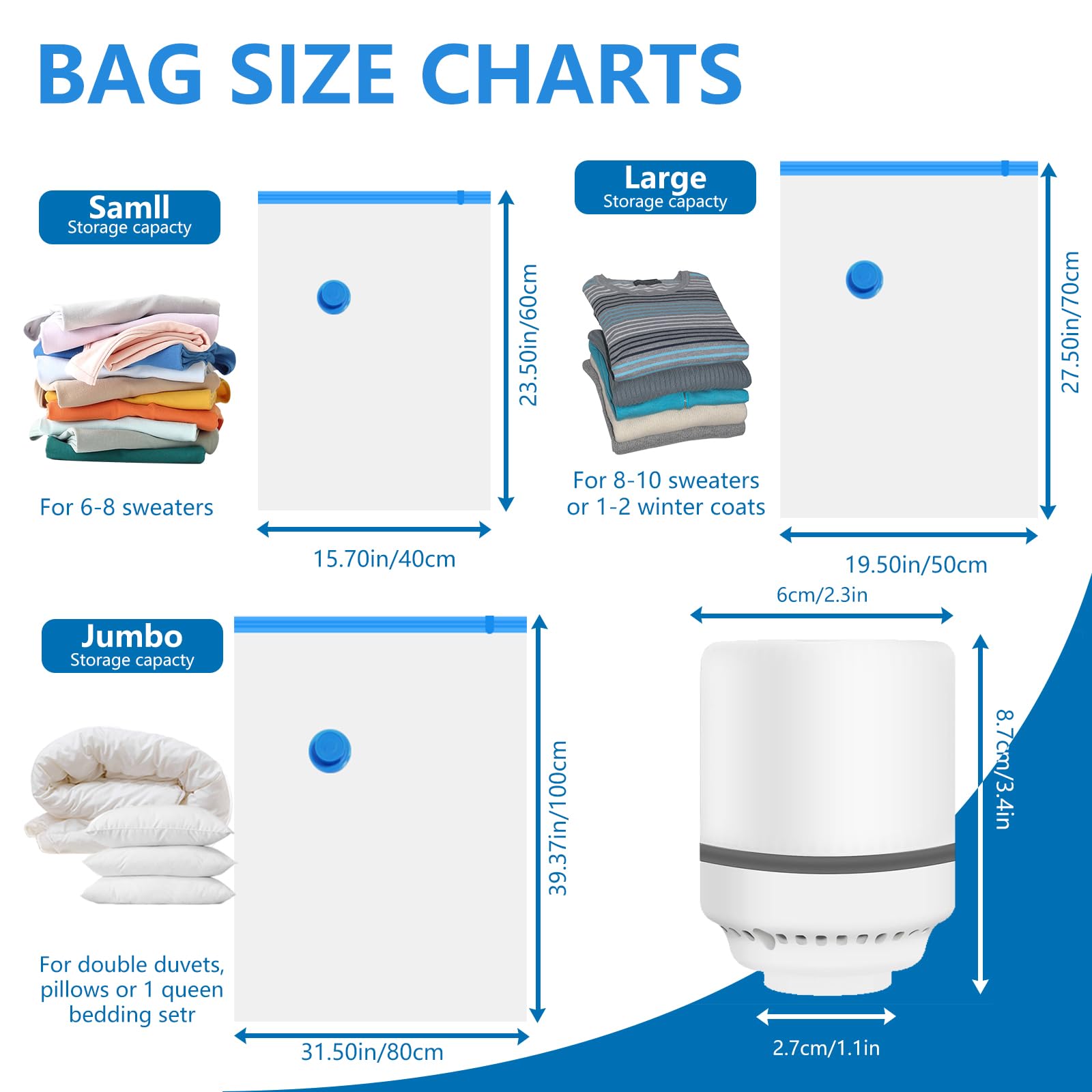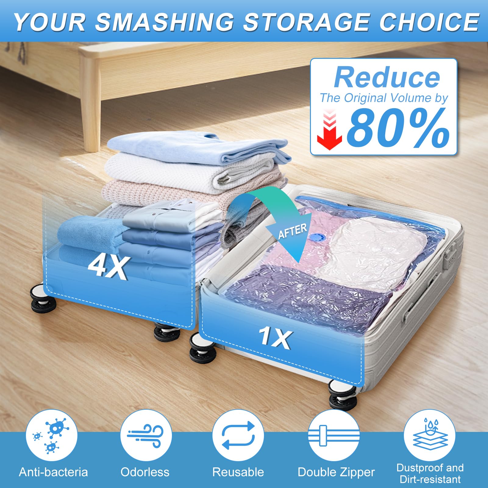 Wow, mit diesen Vakuumbeuteln gewinnst du so viel Platz! 10 Beutel in 4 Größen: 3 Jumbo, 3 Groß, 2 Mittel, 2 Klein. Plus elektrische Pumpe - kein mühsames Auspressen mehr! Einfach Kleidung rein, verschließen, Luft rauspumpen - und schon ist alles auf 20% der Größe geschrumpft! Perfekt für Winterkleidung, Decken oder Reisekoffer. Wasserdicht und staubdicht - deine Sachen bleiben frisch. Nie wieder übervolle Schränke! Einfach benutzen und sich über gewonnenen Platz freuen!