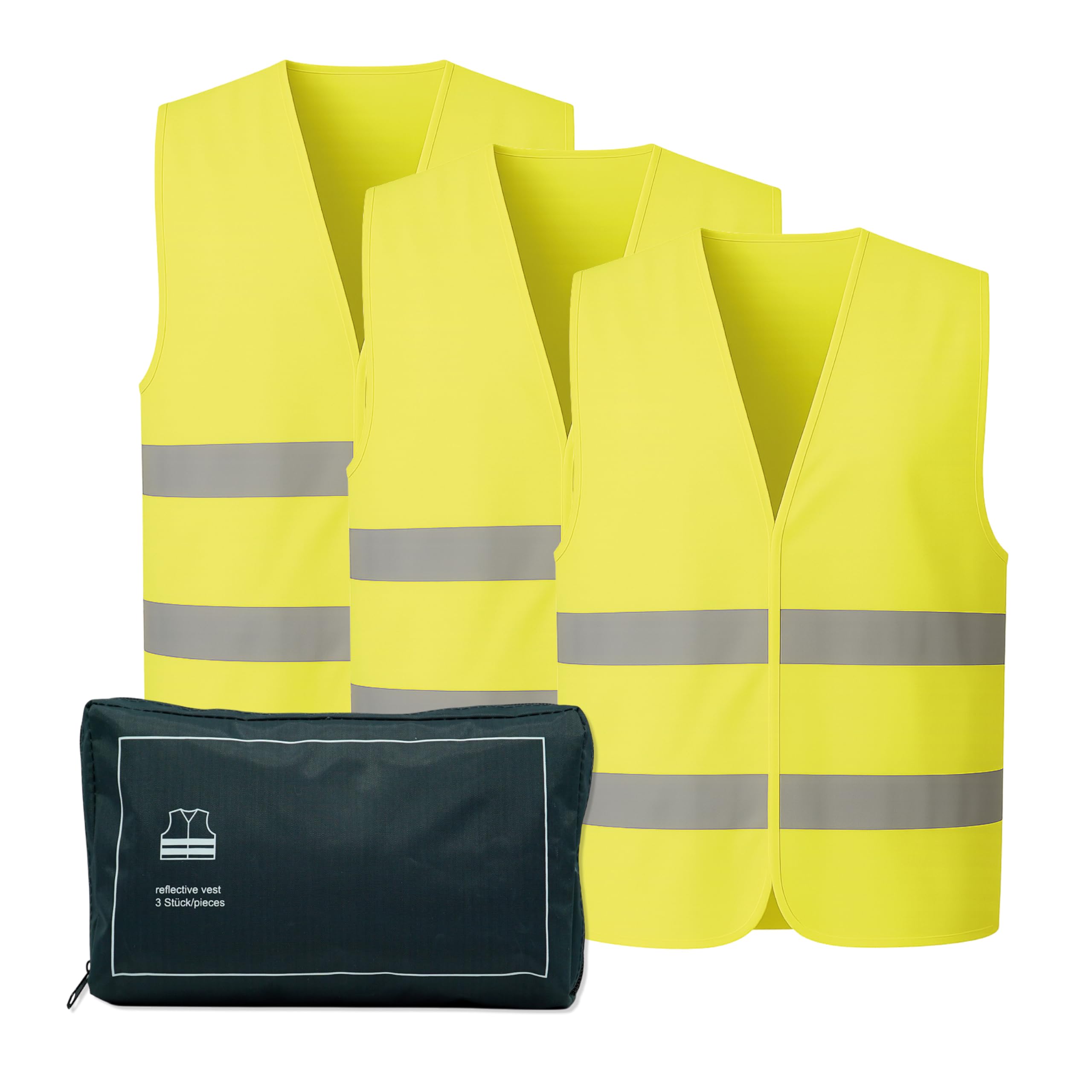 Sicherheit geht vor! Diese 3 Warnwesten im Set sorgen für beste Sichtbarkeit bei Pannen, auf Baustellen oder im Straßenverkehr. In knalligem Neongelb mit reflektierenden Streifen - du wirst auch bei Dunkelheit gut gesehen! Aus leichtem, atmungsaktivem Polyester, wasserdicht und bequem zu tragen. Einheitsgröße passt den meisten Erwachsenen - einfach über die Kleidung ziehen. Wiederverwendbar und umweltfreundlich, nicht wie billige Einweg-Westen. Perfekt für Autofahrer, Radfahrer, Jogger oder Arbeitskräfte auf Baustellen. Einfach bei 40°C waschbar - hält bis zu 50 Waschgängen! Im Auto immer griffbereit für den Notfall. Mit 65x53cm Größe bieten sie ausreichend Schutz. Einfach im Handschuhfach verstauen und im Ernstfall schnell anziehen. Für mehr Sicherheit auf allen Wegen!