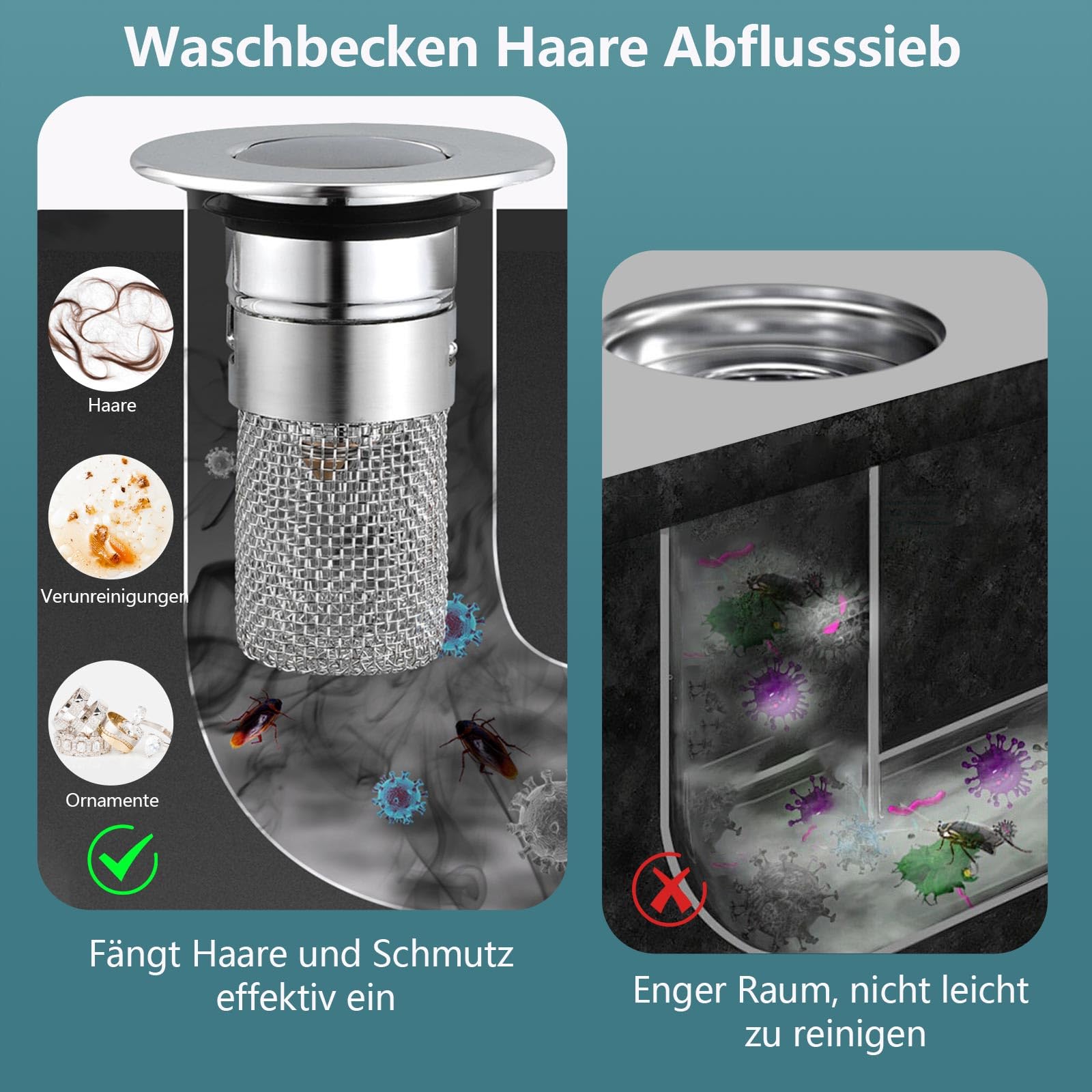 Schluss mit verstopften Abflüssen! Diese 2 praktischen Waschbeckenstöpsel aus Edelstahl 304 mit Messingkern sind die perfekte Lösung. Einfach auf den Knopf drücken - schon wechselst du zwischen Abdichtung und Abfluss. Der herausnehmbare Edelstahl-Filter fängt Haare und Schmutz zuverlässig ab. Passt für Abflusslöcher von 28-35mm Durchmesser - ideal für Waschbecken, Badewannen und Duschen. Die breite Gummidichtung verhindert Gerüche und sorgt für perfekte Abdichtung. Ohne Werkzeug montierbar, rostfrei und extrem langlebig. Endlich ein hygienisches und praktisches Abflusssystem!
