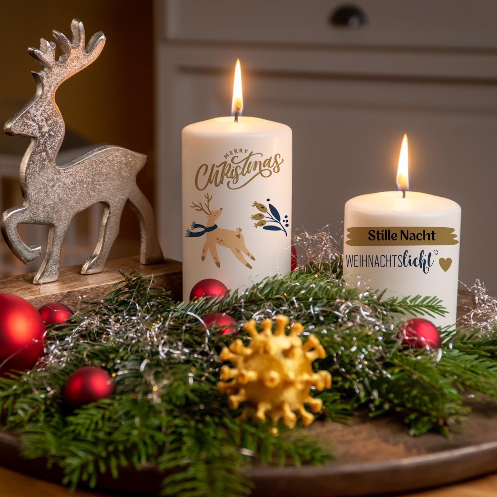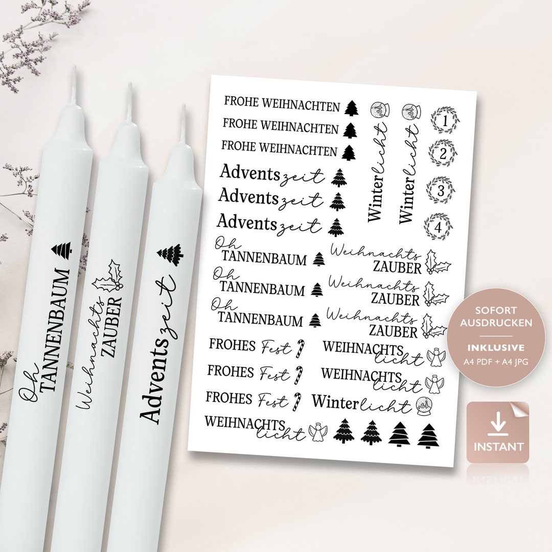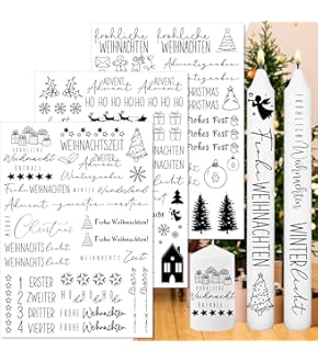 Mach deine Kerzen persönlich! Mit diesen 5 Kerzentattoos gestaltest du langweilige Kerzen im Handumdrehen zu echten Hinguckern. Einfach Motiv ausschneiden, in Wasser tauchen, auf die Kerze legen, andrücken und das Papier abziehen - schon hast du ein perfektes Tattoo! Die Folien sind 21x15 cm groß und haben verschiedene Weihnachtsmotive und Sprüche. Geht nicht nur auf Kerzen, sondern auch auf Keramiktassen oder andere glatte Oberflächen. Perfekt für Weihnachtsgeschenke, Deko oder um einfach mal was Kreatives zu machen. Selbst ohne Bastelerfahrung kriegst du das hin - versprochen! Mach dein Zuhause weihnachtlich oder verschenke personalisierte Kerzen an Lieblingsmenschen.