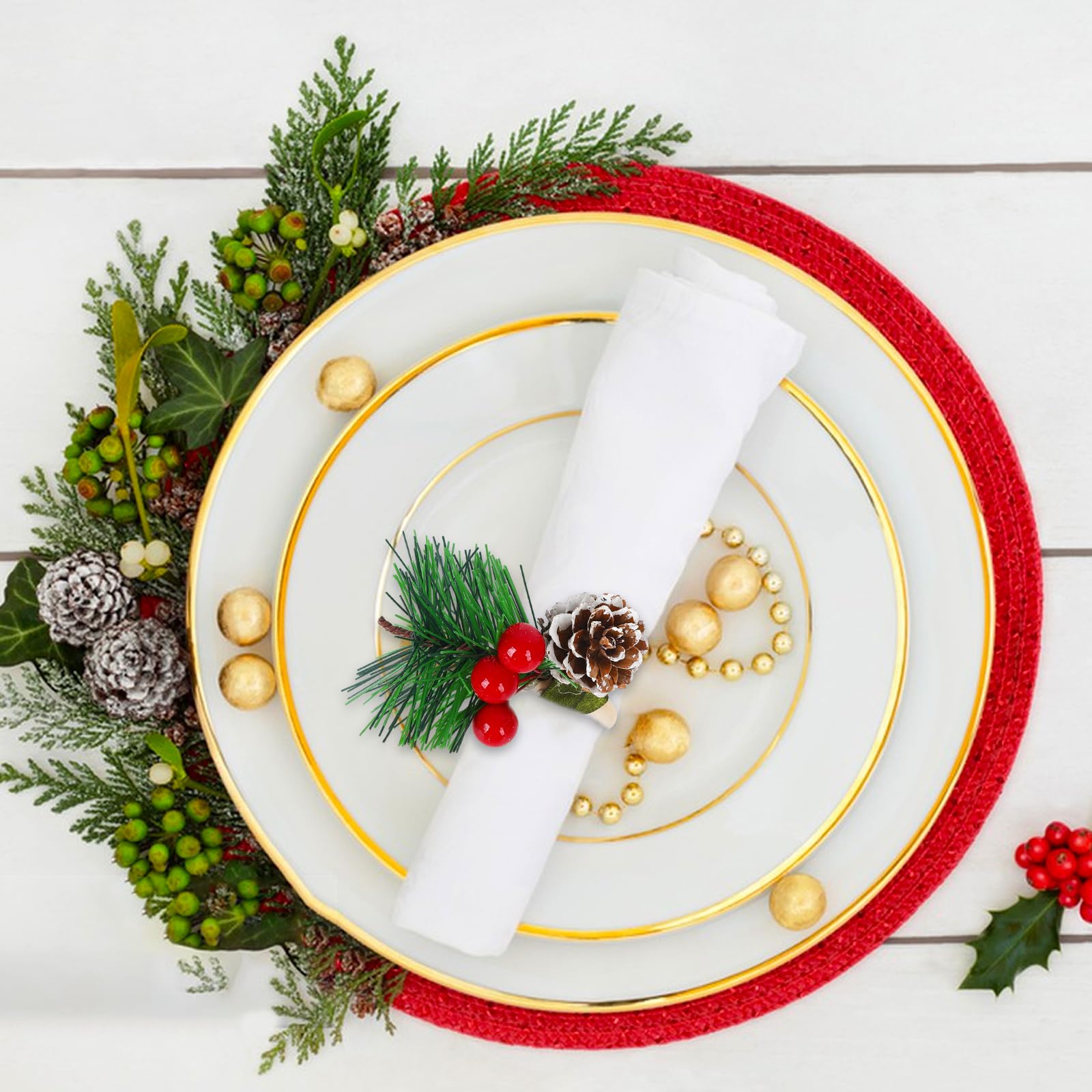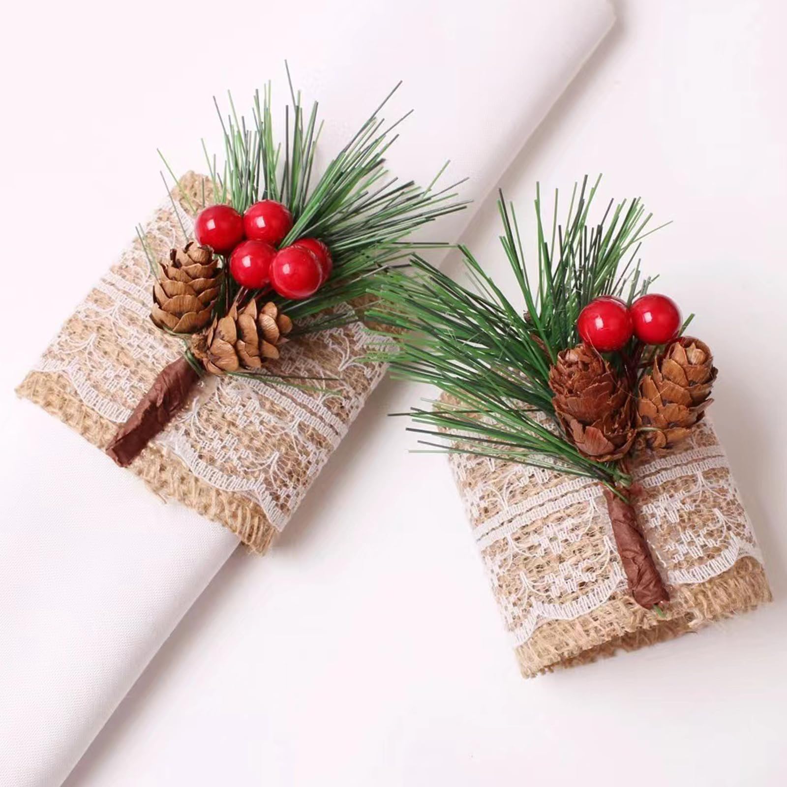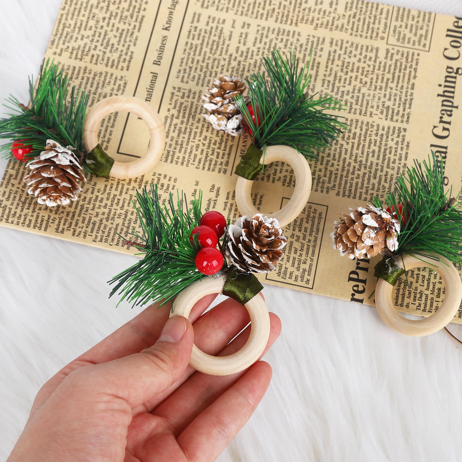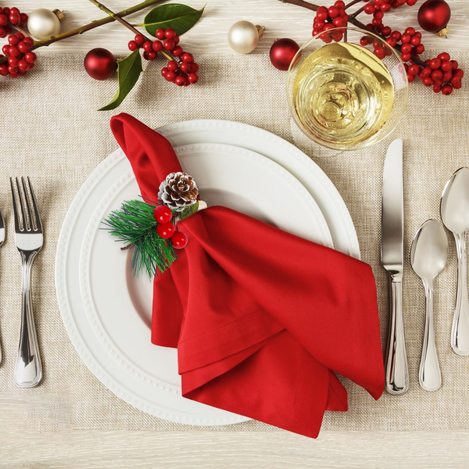 Mach deinen Weihnachtstisch mit diesen niedlichen Serviettenringen noch festlicher! Das Set enthält 12 Stück in zwei verschiedenen Designs - mit roten Beeren und Tannenzapfen-Motiv. Aus hochwertigem Holz gefertigt, stabil und langlebig. Die Oberfläche ist schön glatt und die Verarbeitung top. Perfekt für Weihnachtsessen, Silvesterparty oder festliche Anlässe. Du kannst die Servietten entweder rollen oder kunstvoll falten und durch die Ringe stecken - sieht einfach immer gut aus! Aber die Ringe können noch mehr: Dekoriere damit Weinflaschen, Geschenkboxen oder sogar den Weihnachtsbaum. Super als kleines Mitbringsel oder Gastgeschenk. Die vintage-rote Beeren-Optik passt perfekt zur Weihnachtszeit und sorgt für gemütliche Stimmung. Einfach auspacken, auf den Tisch legen und dich an der festlichen Atmosphäre erfreuen. Praktisch: Nach der Party einfach abwischen und für nächstes Jahr aufbewahren - die Qualität hält lange!