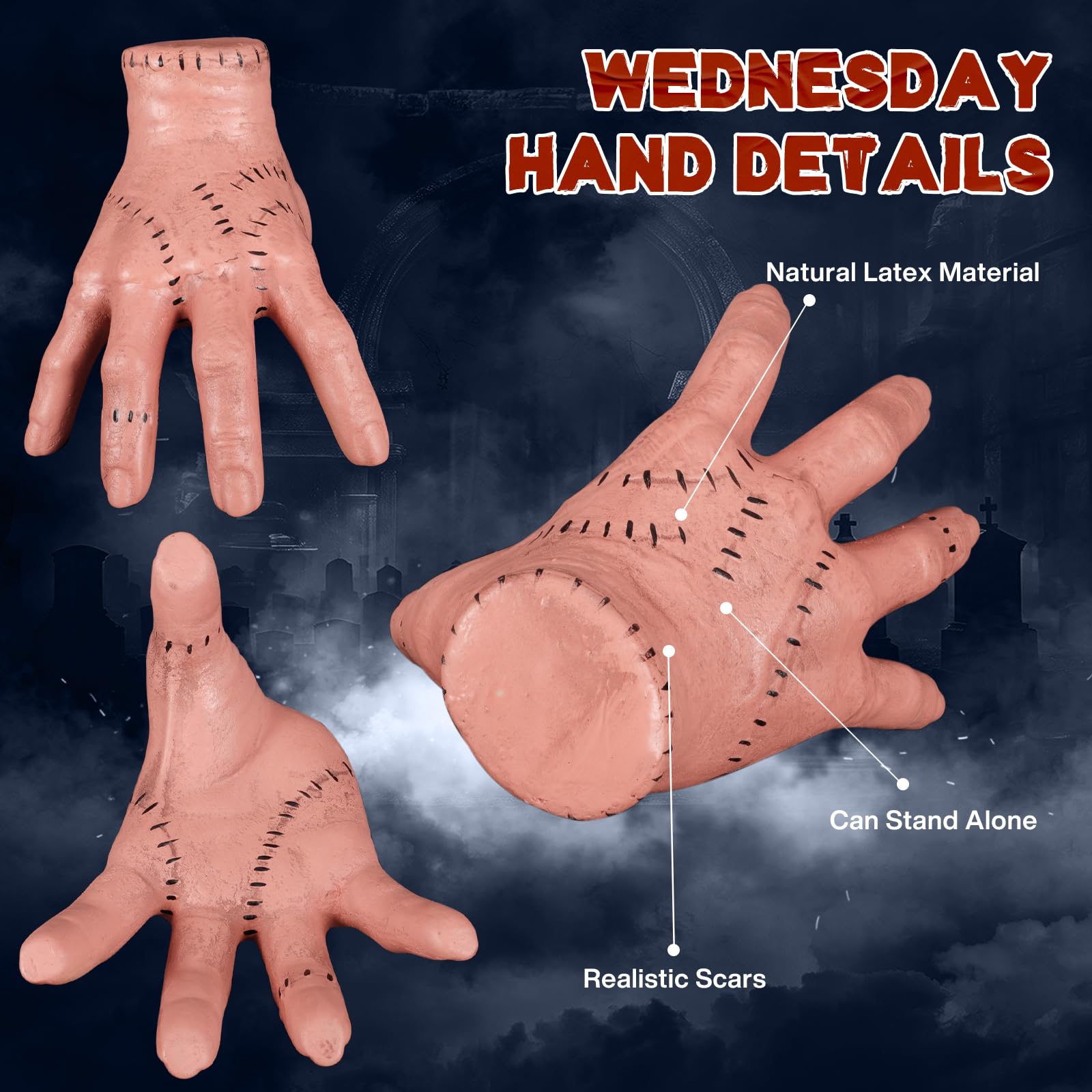 Perfekt als Wednesday Addams verkleidet! Dieses komplette Set mit Perücke und gruseliger Handprothese macht dein Cosplay unvergesslich. Die Perücke aus hochwertiger Kunstfaser ist ca. 55cm lang, super leicht und passt sich perfekt an deine Kopfform an. Sie fühlt sich natürlich an und verheddert sich nicht. Die Handprothese sieht ultra-realistisch aus - mit täuschend echten Nähten und Narben. Das besondere Feature: Sie kann horizontal stehen und sieht aus wie eine laufende Hand! Einfach anziehen und sofort im Wednesday-Character. Perfekt für Halloween-Partys, Cosplay-Events, Karneval oder Mottopartys. Passt für Erwachsene und Kinder gleichermaßen. Mit diesem Set wirst du zum absoluten Highlight jeder Party und ziehst garantiert alle Blicke auf dich. Einfach anziehen und den gruseligen Wednesday-Charme ausstrahlen!