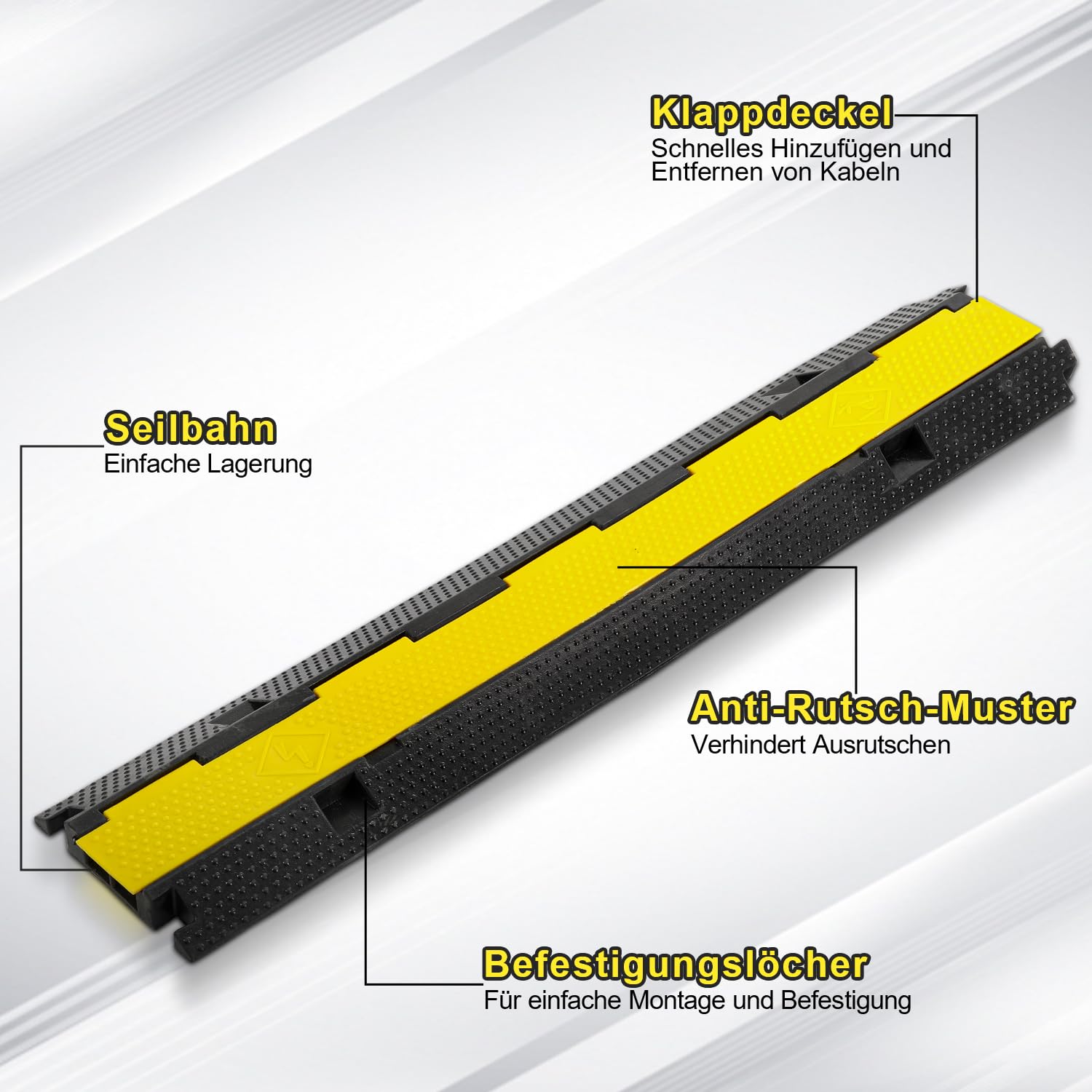 Sicherheit für deine Kabel und Leitungen! Diese Kabelbrücken aus vulkanisiertem Gummi halten bis zu 2000kg aus - perfekt für schwere Fahrzeuge und Geräte. Das Set mit 12 Stück deckt große Flächen ab. Maße: 100x25x5cm mit 33x33mm Innenschlitzen. Die schwarz-gelbe Farbe sorgt für gute Sichtbarkeit und verhindert Stolperunfälle. Durch die gezahnten Verbindungsstellen lassen sich mehrere Brücken einfach kombinieren. Ohne zusätzliche Befestigungsmittel montierbar. Ideal für Baustellen, Veranstaltungen oder Parkplätze. Schützt deine Kabel vor Beschädigungen und sorgt für mehr Sicherheit!