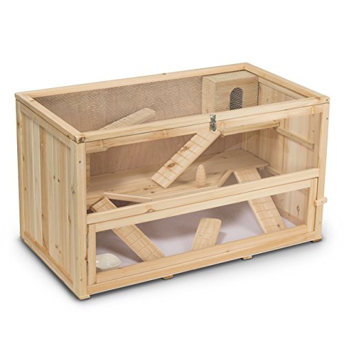 Wow, was für ein tolles Zuhause für deine kleinen Lieblinge! Dieser 3-stöckige Käfig aus naturbelassenem Holz bietet alles, was Hamster, Mäuse, Ratten und andere Kleintiere brauchen. Mit 115x60x58 cm Außenmaßen ist er geräumig genug für ausgiebiges Toben! Drei Ebenen, verbunden mit kleinen Holzstegen und Rampen, sorgen für Abwechslung und Bewegung. Zwei Häuschen bieten Rückzugsmöglichkeiten für Ruhephasen. Die Front aus Plexiglas im Holzrahmen gibt dir freie Sicht auf deine Tiere, und der aufklappbare Deckel aus Stahlgitter macht die Reinigung und Fütterung super einfach. Eine Tür lässt sich frontal öffnen - praktisch! Die stabile Konstruktion garantiert Langlebigkeit, und der natürliche Holzlook passt in jede Wohnung. Montageanleitung und alles nötige Material ist dabei. Wenn du also ein artgerechtes, sicheres und schönes Zuhause für deine Kleintiere suchst, das auch noch gut aussieht, dann ist dieser Käfig genau das Richtige! Einfach aufbauen und deine Tiere werden sich pudelwohl fühlen!
