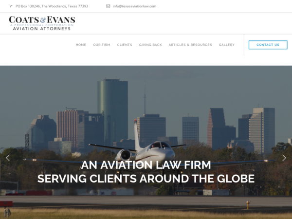 Coats & Evans not only represents the aviation community, it is an active participant. Coats & Evans uses three aircraft to support its active practice. These aircraft enable Coats & Evans' attorneys to travel quickly and efficiently to trials, hearings, depositions, inspections and meetings without submitting to the vagaries and risk of airline schedules, delays, routes and security concerns. This capability saves Coats & Evans' clientele significant legal fees otherwise incurred in travel time.