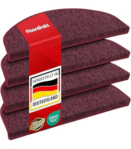Sicherheit und Style für deine Treppe! Dieses 15-teilige Set Stufenmatten in Weinrot macht jede Treppe zum Hingucker. Maße: ca. 65x24 cm mit 3,5 cm Höhe. Aus robustem 100% Polypropylen mit Schlingenware - hält auch bei starkem Verkehr was aus. Die Umkettelung verhindert Ausfransen, die Gitternetz-Rückseite gibt Stabilität. Inklusive Winkelschiene und Klebeband für einfache Montage an der Stufenkante. Einfach die Stufen vorher sauber machen, Klebeband abziehen und festdrücken. Die marmorierte Optik kaschiert kleine Verschmutzungen super. Meist reicht Absaugen, bei stärkerer Verschmutzung mit feuchtem Tuch reinigen. Mach deine Treppe sicherer und schöner - ob im Haus oder der Wohnung. Mit diesem Sparset hast du genug für eine komplette Treppe. Gute Qualität zum fairen Preis!