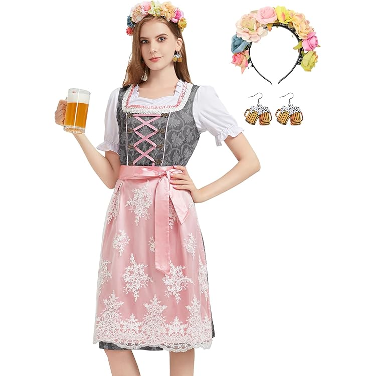 Wiesn-Feeling pur mit diesem traditionellen Dirndl! Perfekt fürs Oktoberfest, Volksfeste oder Karneval. Erhältlich in Größen von S bis 5XL - für jede Figur das passende Kleid. Das Midi-Modell mit retro Korsett-Optik und wunderschönen Bestickungen. Romantische Spitzen-Dekorationen verleihen dem Dirndl eine besondere Raffinesse. Aus hochwertigem Trachtenstoff gefertigt, der sich angenehm trägt. Mit den typischen Dirndl-Details, die jedes Festoutfit komplett machen. Ob für die Wiesn, Kirchweih oder Halloween-Party - mit diesem Dirndl bist du immer perfekt gekleidet und fühlst dich wie eine echte Bayerin!