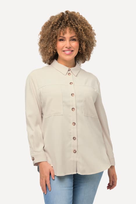 Diese Cordbluse von Ulla Popken ist total gemütlich und sieht trotzdem stylisch aus! Aus weichem Babycord gemacht - fühlt sich an wie eine Umarmung. Der Classic Fit ist super bequem und die langen Ärmel sind weiter geschnitten, nichts ziept oder zwackt. Mit dem klassischen Hemdkragen und der Knopfleiste sieht die Bluse richtig schick aus, ist aber trotzdem total alltagstauglich. Die Brusttasche ist praktisch für Brille oder Kleinkram. Besonders cool: Der Saum ist unten rund und hat Seitenschlitze - so hast du noch mehr Bewegungsfreiheit. Die Ärmelenden sind mit Elasthan, das sitzt perfekt ohne einzuschneiden. Und das Beste: 100% Baumwolle! Das heißt, die Bluse ist angenehm auf der Haut und kratzt nicht. Perfekt fürs Büro, für einen Stadtbummel oder einfach für gemütliche Tage zu Hause. In verschiedenen Größen erhältlich - such dir deine Lieblingsfarbe aus!