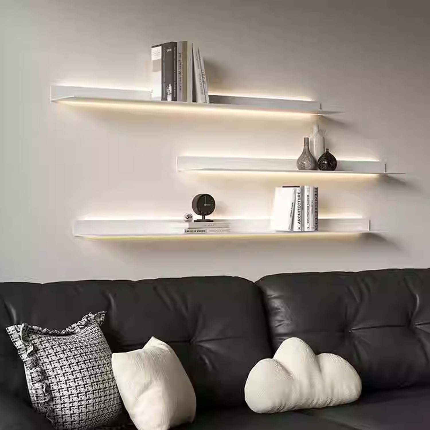 Hey! Dieses Wandregal ist echt der Hingucker - mit integrierter LED Beleuchtung die sich per Fernbedienung steuern lässt! 7 geräumige Ebenen bieten viel Platz für Bücher, Deko, Pflanzen oder was auch immer du zeigen willst. Die Platten sind 25mm stark, richtig stabil und langlebig. Montage geht sowohl horizontal als auch vertical - total flexibel! Die LED Leuchten haben warmes und kaltes Licht, Helligkeit von 50-100% einstellbar und Timer für 15/30/60/120 Minuten. Maße: 195x23,5x25cm - passt in fast jeden Raum. Ob im Wohnzimmer, Büro oder Schlafzimmer - dieses Regal macht immer eine gute Figur. Einfach an die Wand dübeln, Kabel verstecken und schon hast du eine professionelle Beleuchtung die deine Sachen perfekt in Szene setzt. Das weiße Design ist zeitlos und passt zu jedem Einrichtungsstil. Perfekt für alle die mehr Stauraum und gleichzeitig coole Beleuchtung wollen. Einfach montieren und staunen!