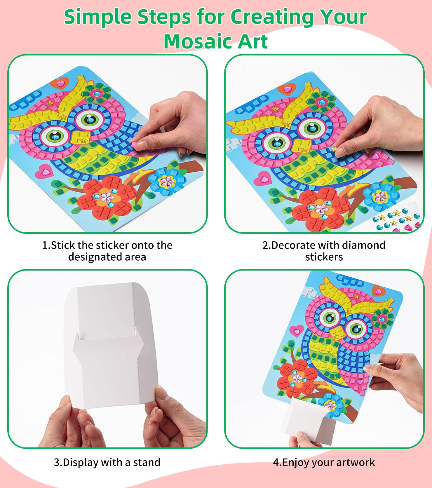 Mama, Papa - ich will basteln! Mit diesem JurciCat Mosaik Bastelset haben Kinder ab 5 Jahren stundenlang Spaß. Im Set sind 12 verschiedene Motive mit Delfinen, Elefanten, Prinzessinnenschlössern und mehr. Jedes Bild ist 17x24cm groß - perfekt für kleine Kinderhände. Einfach die bunten Sticker auf die entsprechenden Felder kleben und schon entstehen wunderschöne Kunstwerke! Das fördert die Feinmotorik und die Konzentration - und macht dabei riesig Spaß. Perfekt für Regentage, Kindergeburtstage oder als Beschäftigung in den Ferien. Auch super für die Eltern-Kind-Zeit zusammen. Die hochwertigen Papiere und Aufkleber halten gut und die leuchtenden Farben begeistern jedes Kind. Toll als Geschenk zu Weihnachten, Geburtstagen oder einfach als Überraschung. So werden kleine Künstler zu großen Stolz - und die Kunstwerke können das Kinderzimmer verschönern. Einfach auspacken und loslegen - der Kreativität sind keine Grenzen gesetzt!
