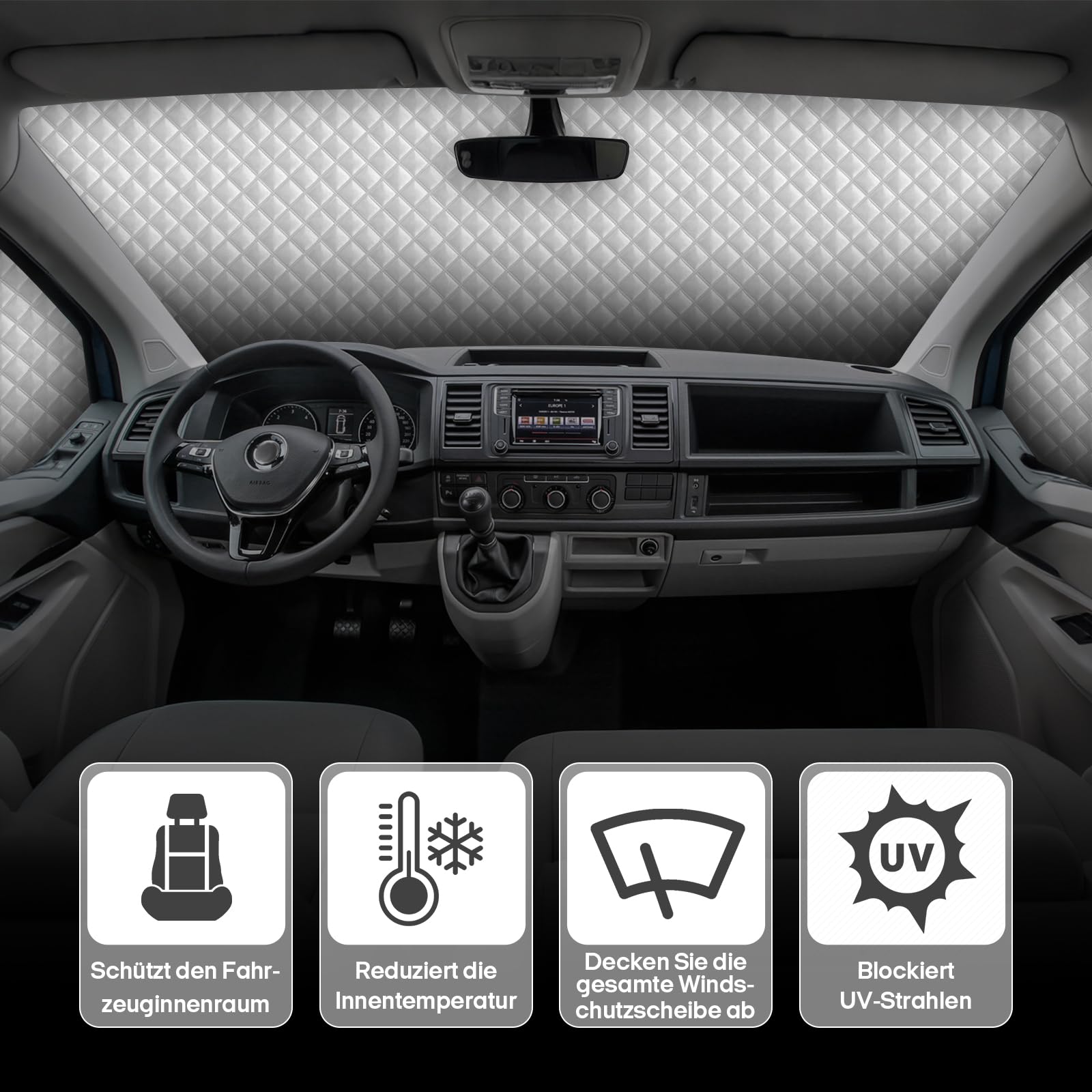 Puh, bei sommerlicher Hitze wird's im Auto schnell unerträglich - aber mit diesem Sonnenschutz-Set bleibst du cool! Speziell für VW T5 und T6 entwickelt, schützt es dein Fahrzeug innen vor übermäßiger Hitze. Die silberne Aluminium-Oberfläche reflektiert die UV-Strahlen effektiv und hält dein Auto bis zu 20°C kühler. Das Komplettset enthält alles, was du brauchst: Frontscheibenabdeckung, 6 Seitenscheibenabdeckungen, Heckscheibenabdeckung und 40 Saugnäpfe für die sichere Befestigung. Die Installation ist mega einfach - keine Kleber oder komplizierten Handgriffe nötig. Einfach mit den Saugnäpfen ans Glas drücken und schon ist dein Auto geschützt. Nach Gebrauch lässt sich alles platzsparend in der mitgelieferten Tasche verstauen. Perfekt für Camper, Wohnmobile oder alle, die ihr Auto vor Sonnenschäden schützen wollen. Deine Sitze, das Lenkrad und der Innenraum werden es dir danken!
